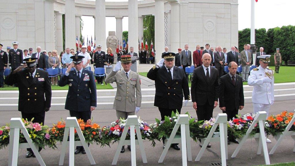 Members of the official party salute after laying wreaths during the 2014 Memorial Day Ceremony at St. Mihiel American Cemetery in France.