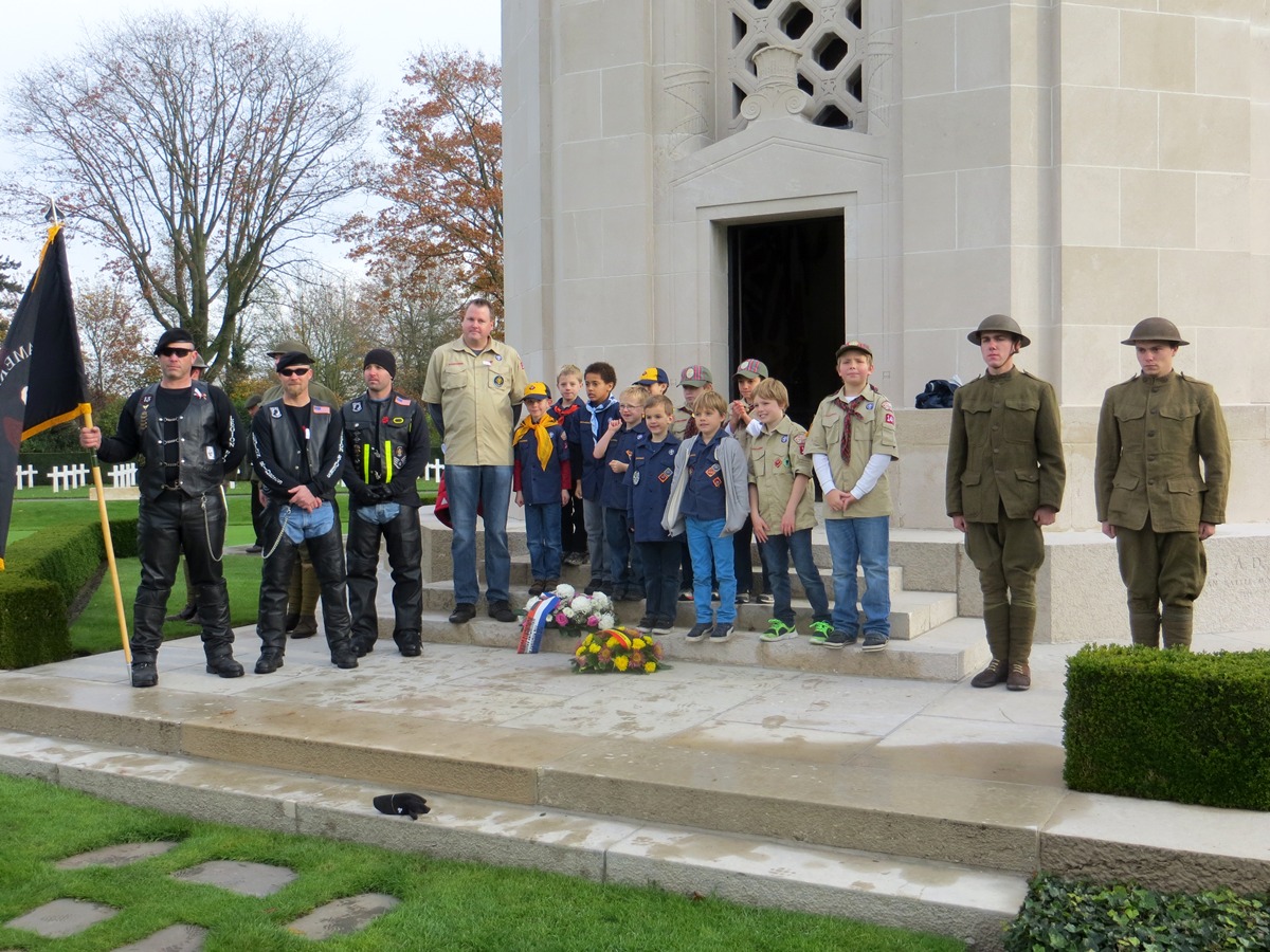 Ceremony participants stand in front of the chapel at Flanders Field American Cemetery during the 2013 Veterans Day Ceremony.