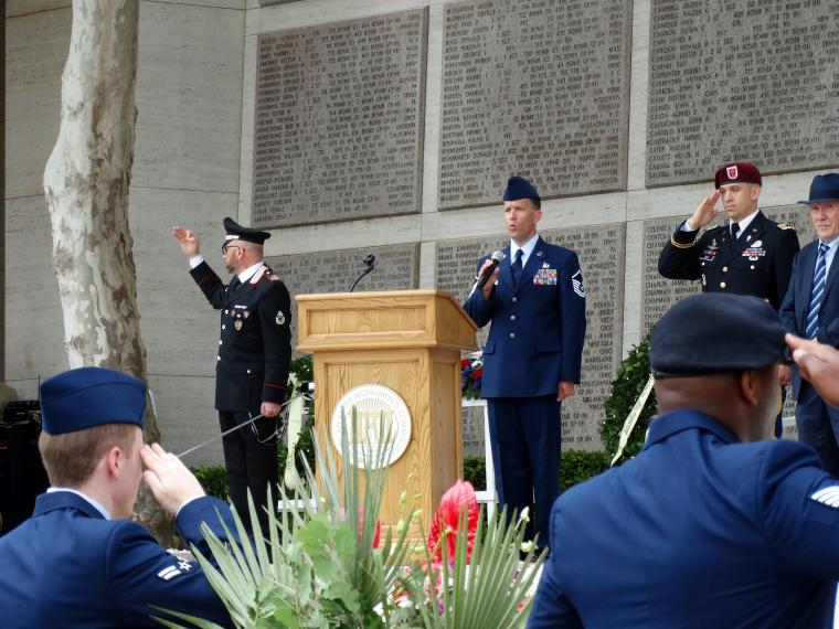 MSgt. Mayo sings the American national anthem during the 2018 Memorial Day Ceremony at Florence American Cemetery in Italy.