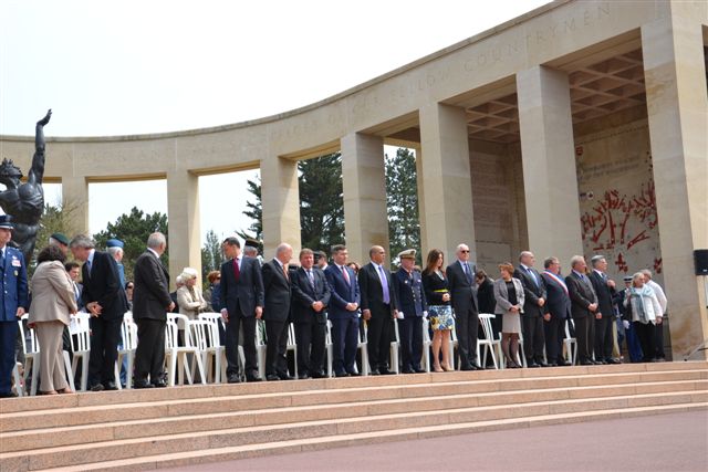 Officials stand in the memorial area during the 69th anniversary commemoration of the D-Day landings at Normandy American Cemetery.