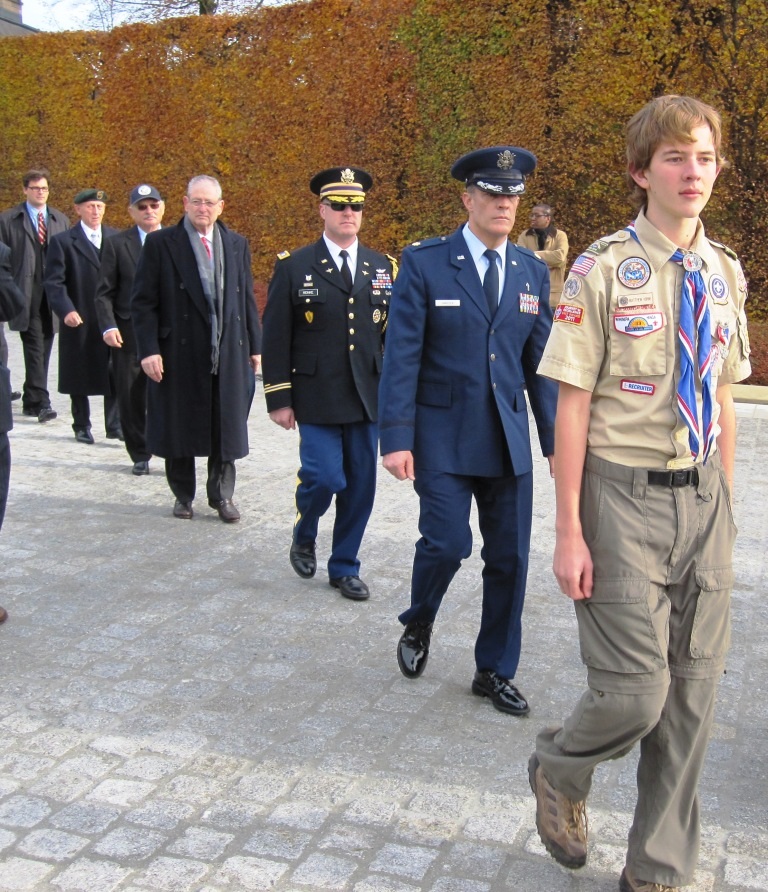Participants form a straight line as they march in during the 2012 Veterans Day ceremony at Luxembourg American Cemetery.