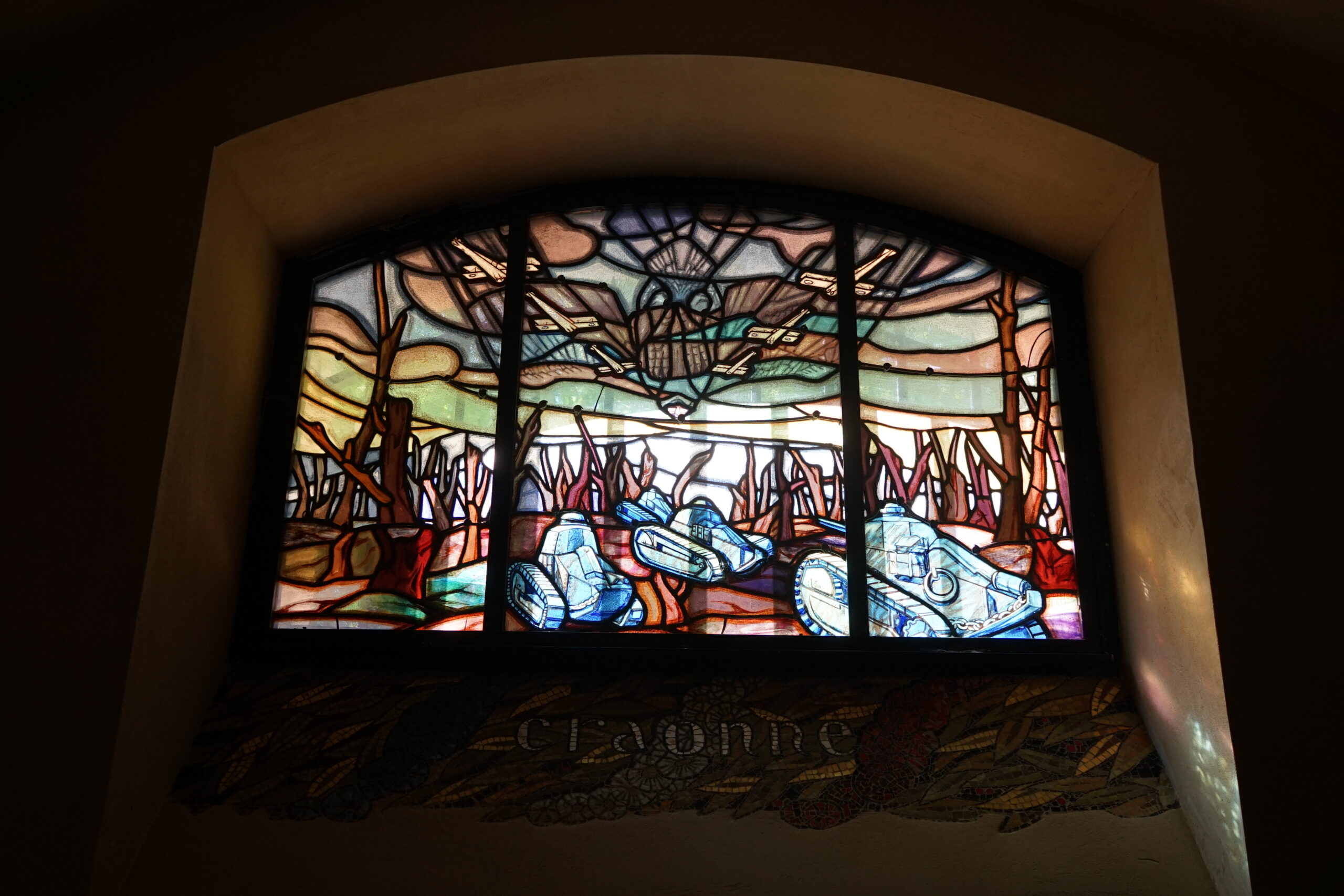 Intricate stained-glass windows can been seen from inside the crypt at the Lafayette Escadrille Memorial Cemetery.