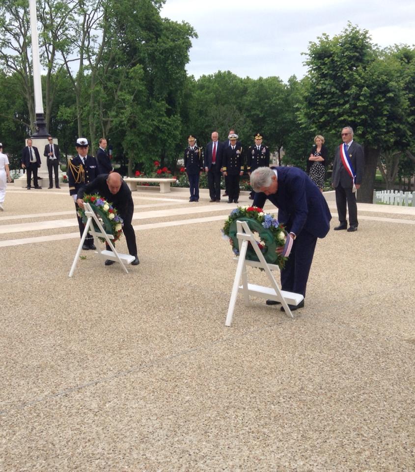 Secretary of Defense Chuck Hagel and French Minister of Defence Jean-Yves Le Drian lay wreaths at Suresnes American Cemetery