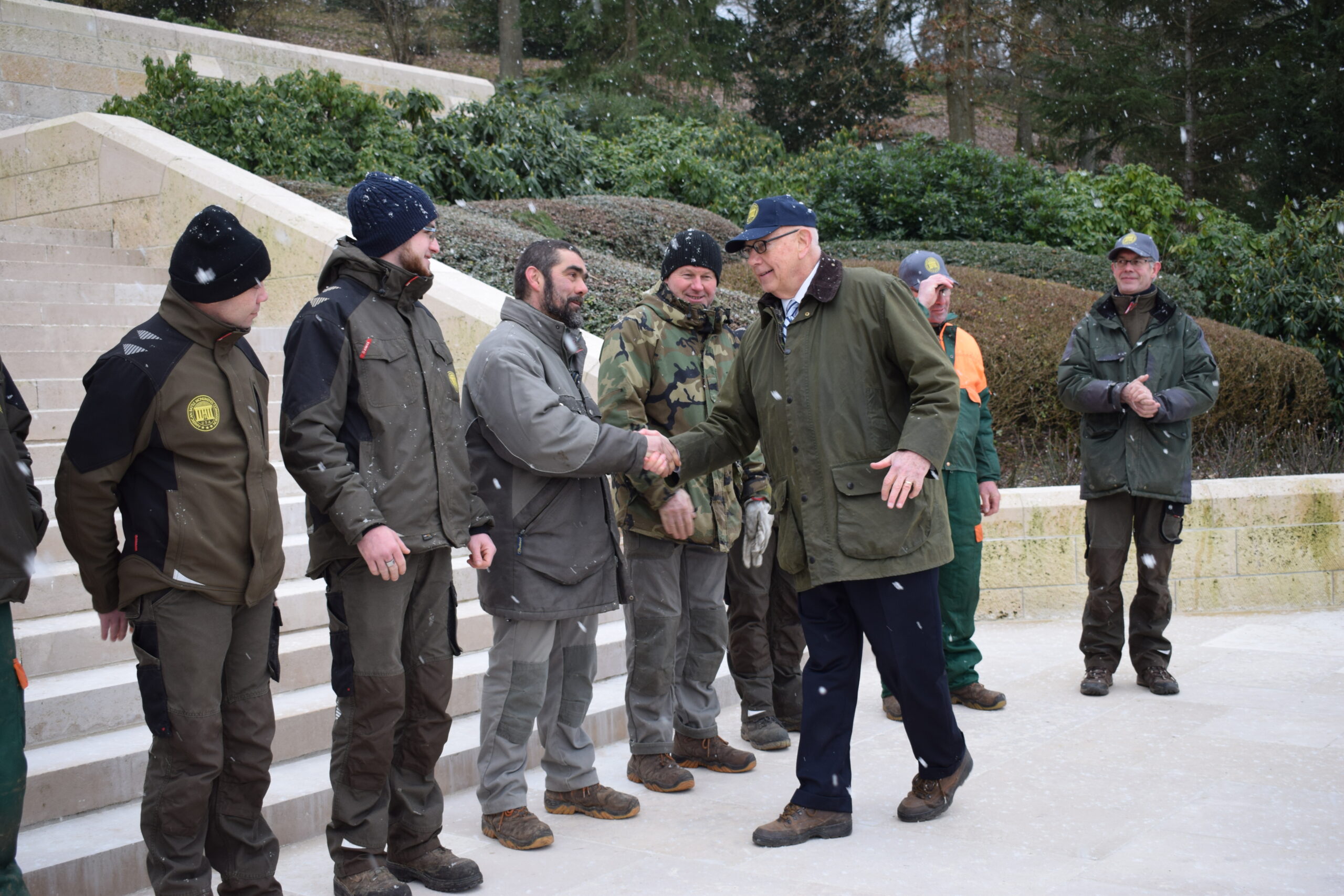 Secretary Matz shakes hands with a man amidst snow fall.