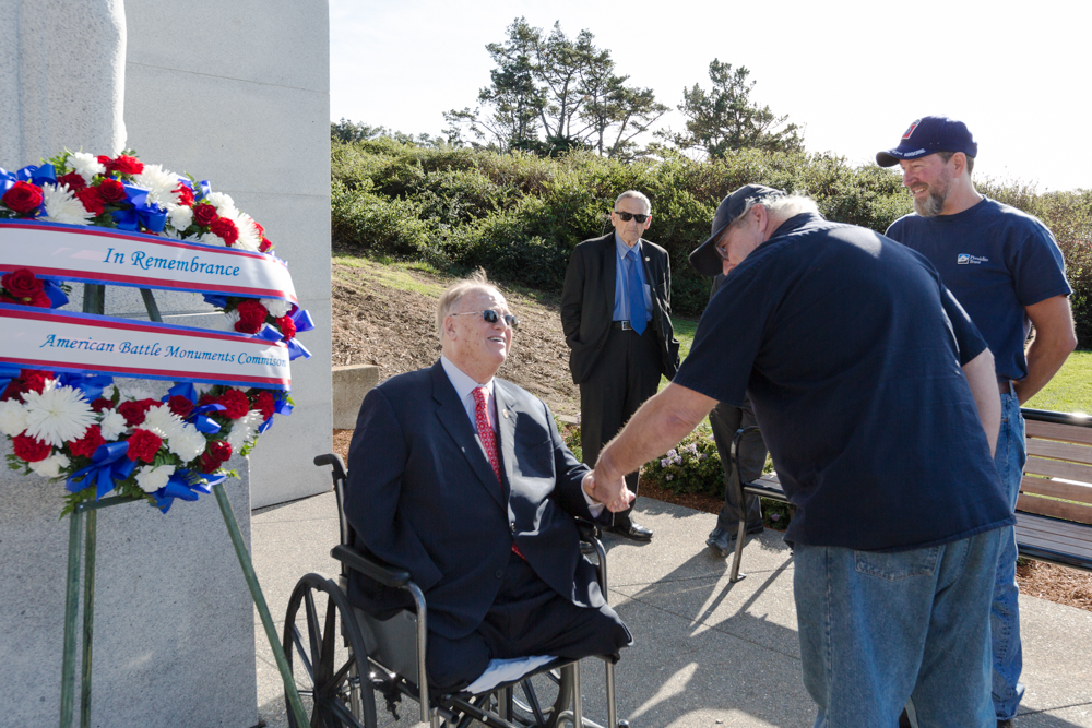 ABMC Secretary Max Cleland greets attendees after the rededication ceremony. Image courtesy of Charity Vargas Photography.