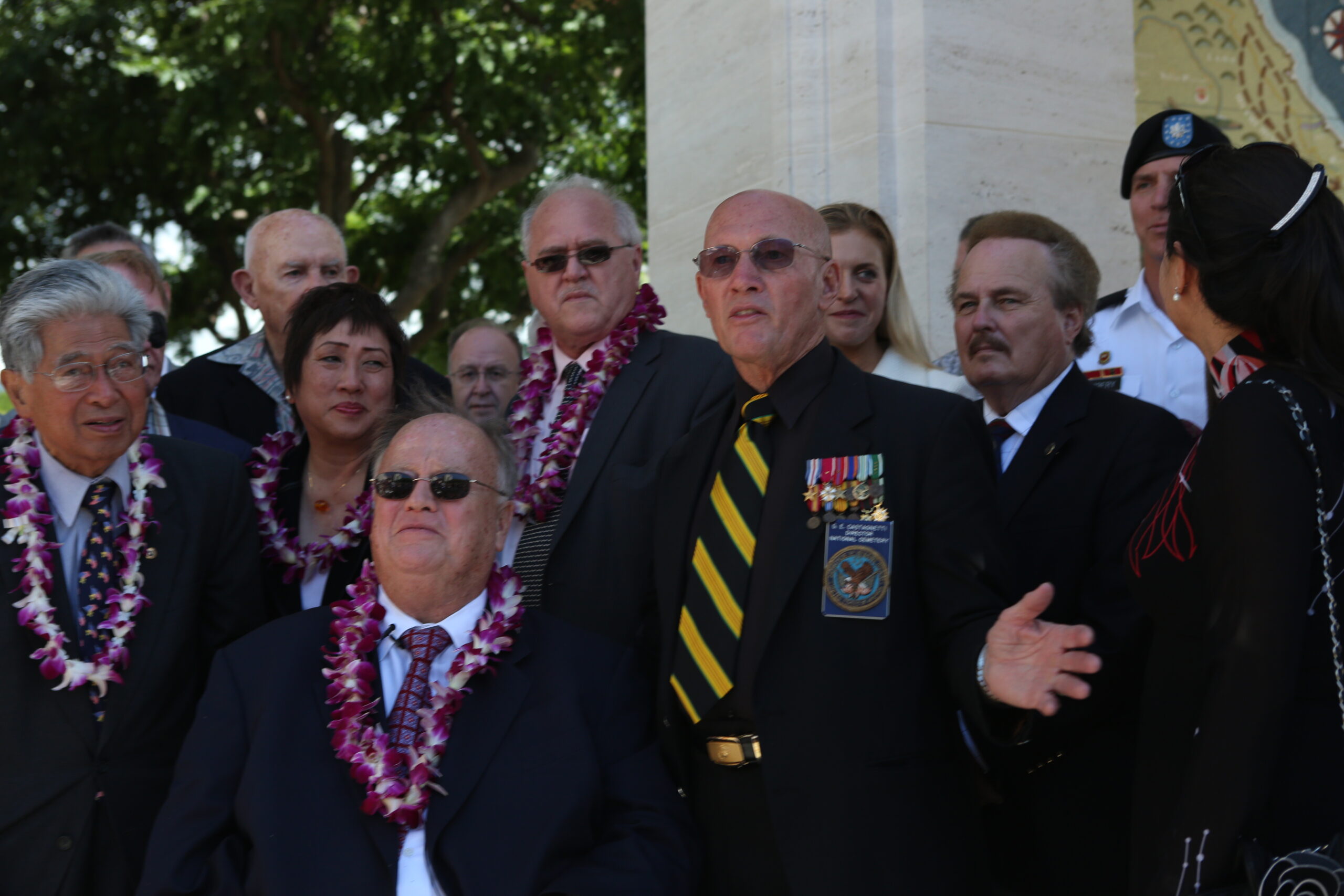 Senator Daniel Akaka, Congresswoman Colleen Hanabusa, ABMC Secretary Max Cleland, and National Cemetery of the Pacific Superintendent Gene Castagnetti stand in front of the new pavilions after the dedication.