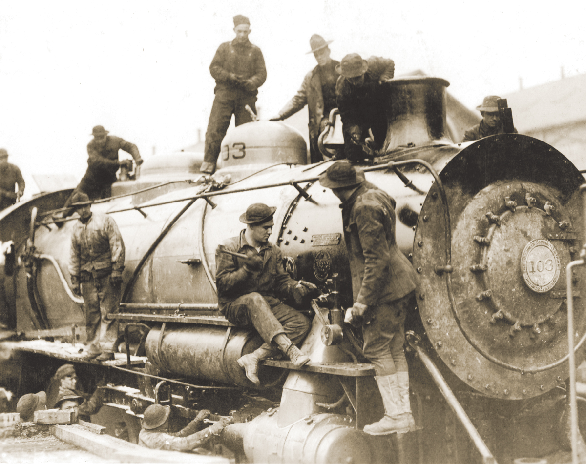 Services of Supply (SOS) soldiers build a locomotive at the assembly plant in St. Nazaire. Image courtesy of The National Archives.