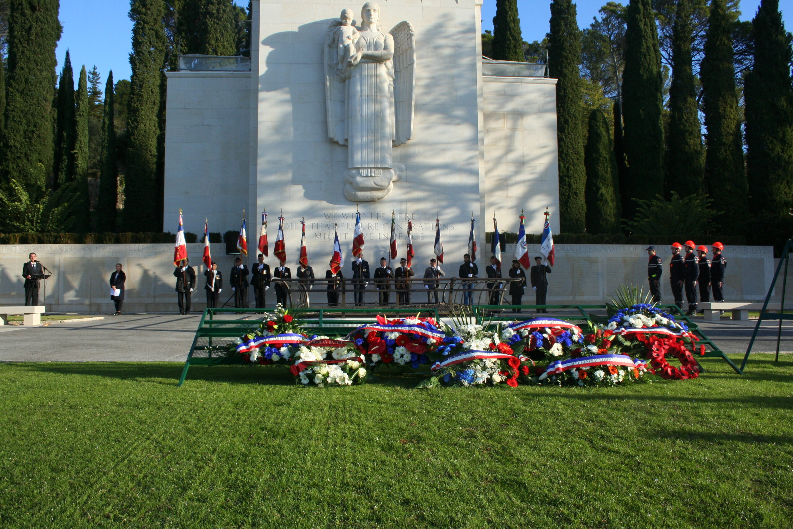 Multiple floral wreaths were laid during the 2016 Veterans Day Ceremony at Rhone American Cemetery.