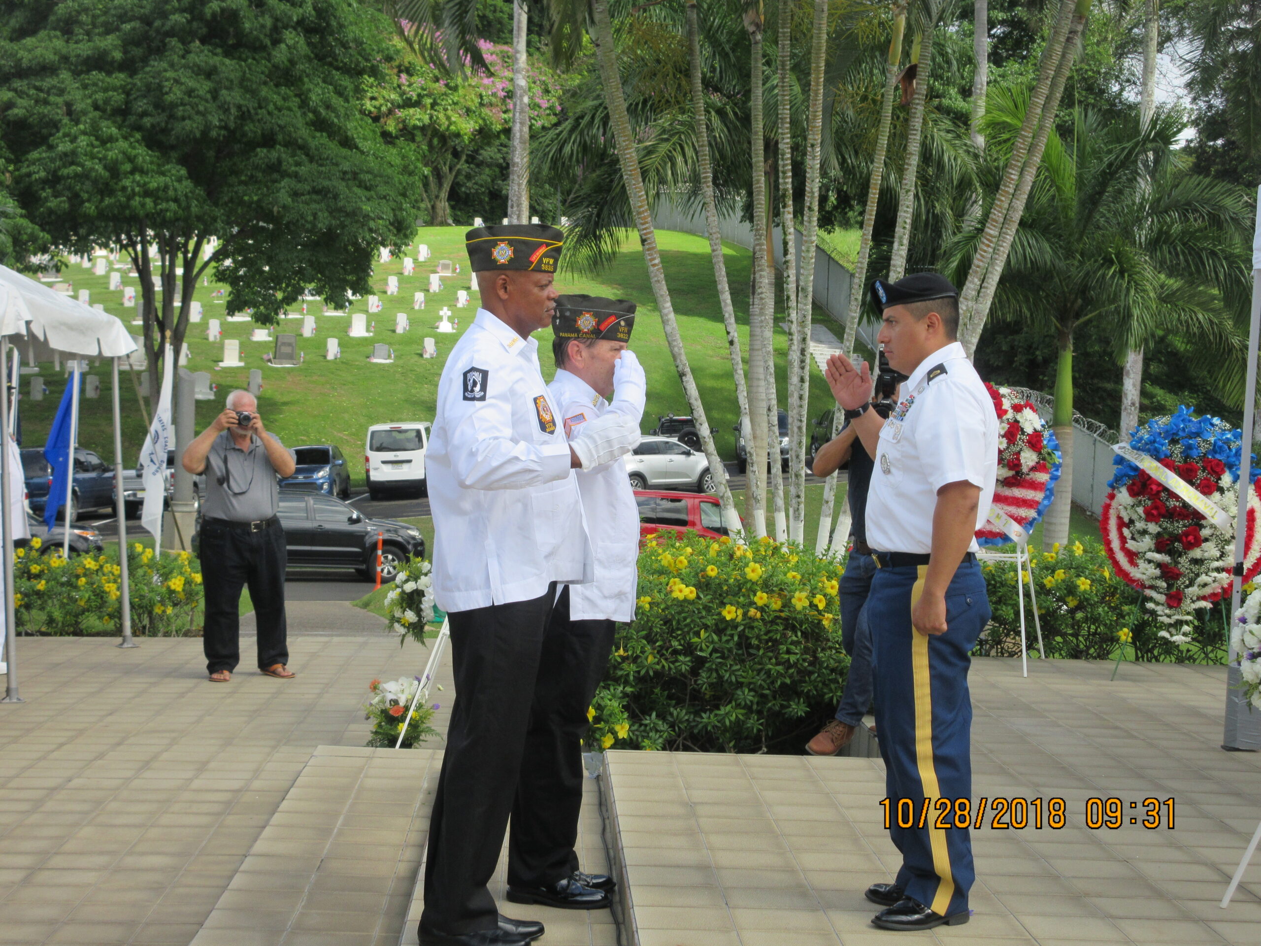 A soldier salutes during the wreath laying portion of the 2018 Memorial Day Ceremony at Corozal American Cemetery.
