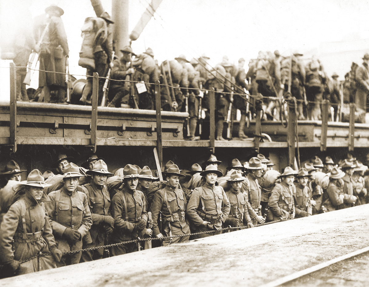 Soldiers of the U.S. 4th Infantry Regiment debarking from a ship at Brest, April 18, 1918.