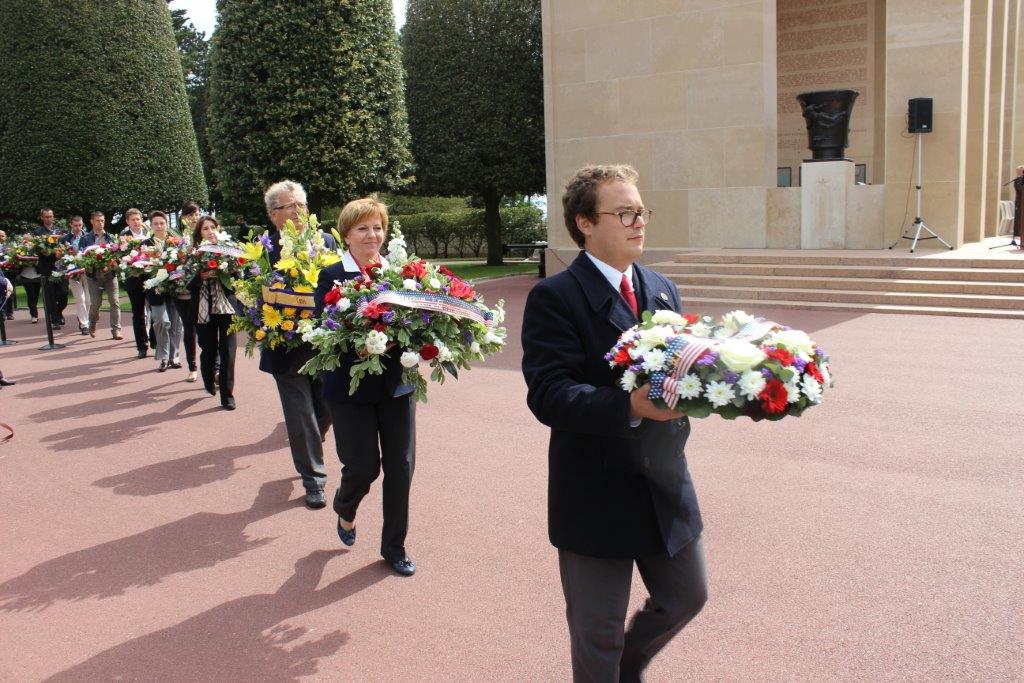 Normandy American Cemetery staff assist with the floral wreaths during the 2015 Memorial Day Ceremony.