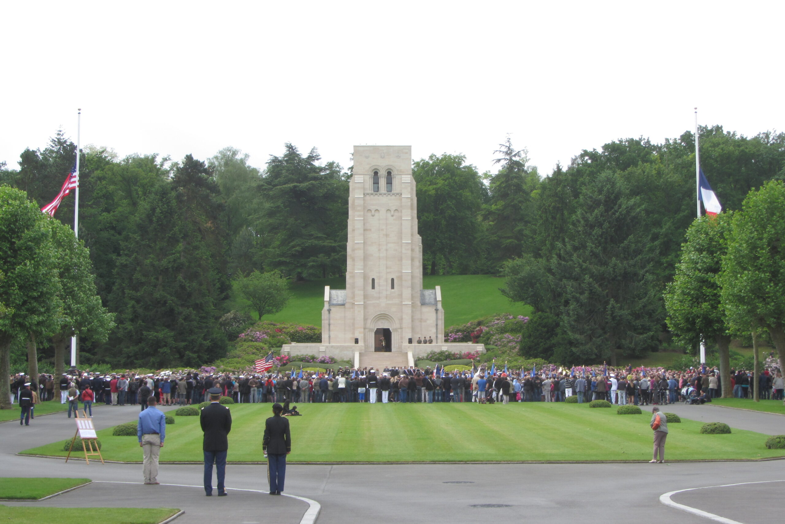 The colors are raised during the 2015 Memorial Day Ceremony at Aisne-Marne American Cemetery. Image courtesy of Micheline and Daniel Atkinson.