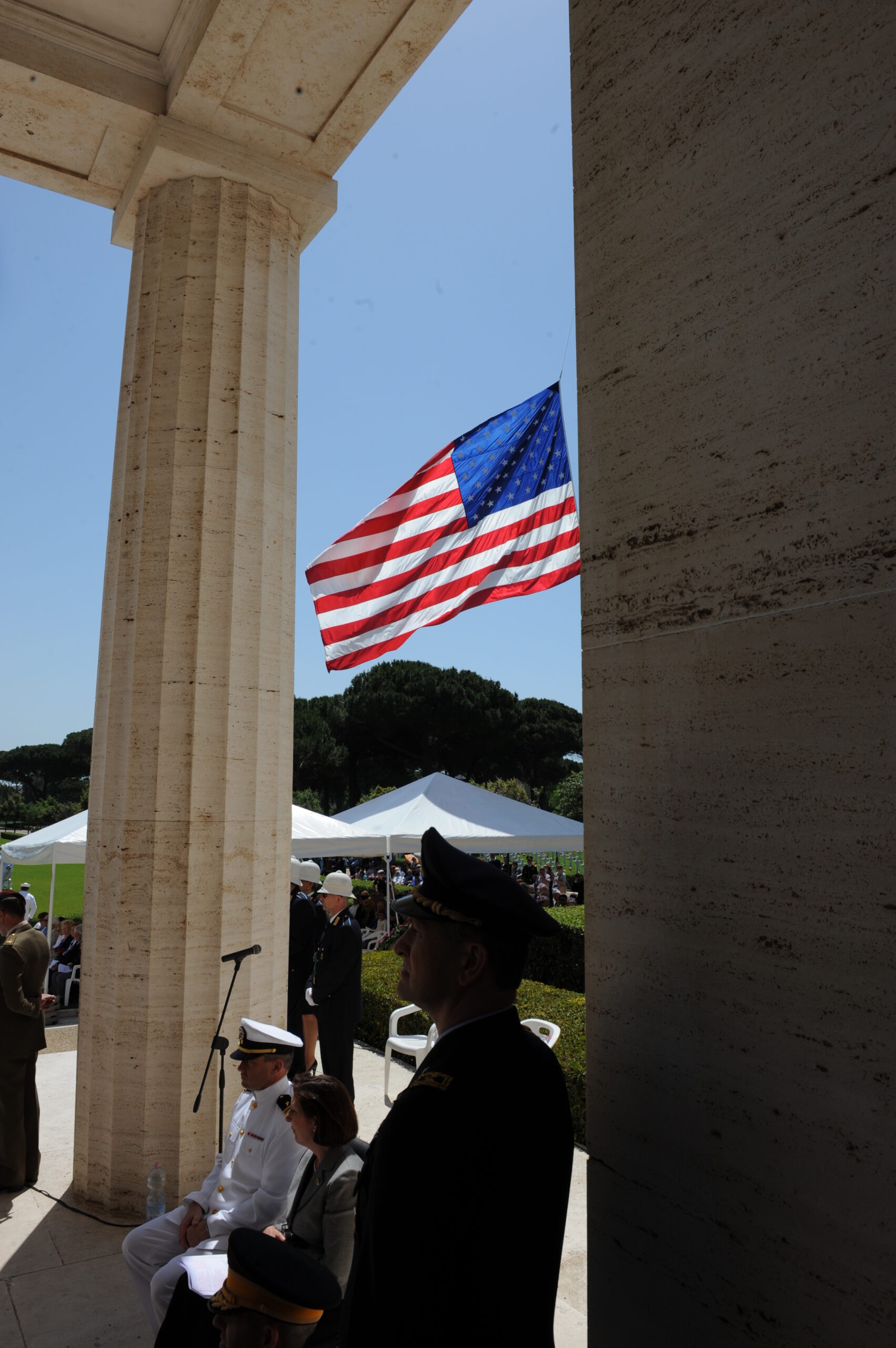 The American flag flaps in the wind during the 2014 Memorial Day Ceremony at Sicily-Rome American Cemetery in Italy.