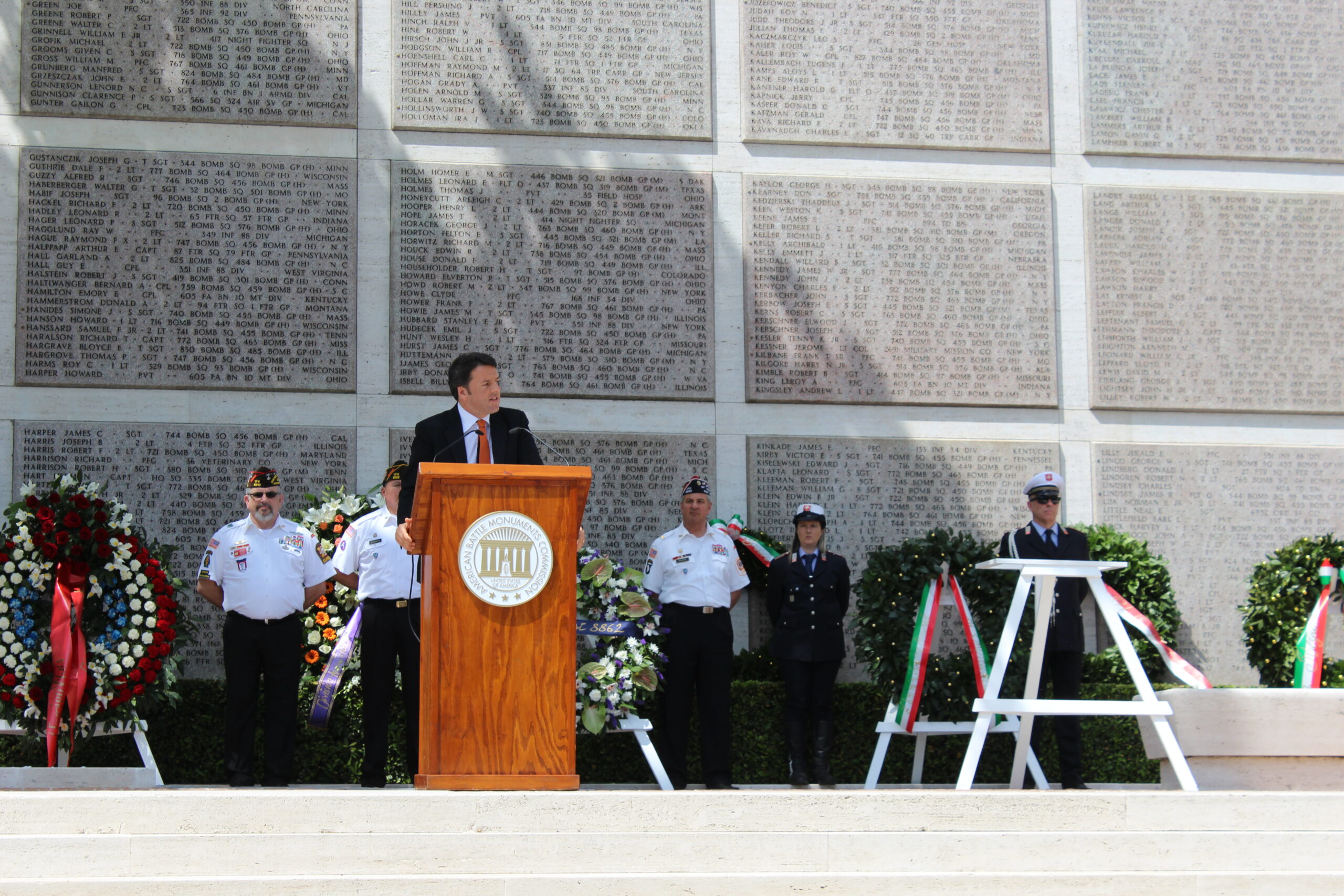 Italian Prime Minister Matteo Renzi delivers remarks during the 2015 Memorial Day Ceremony at Florence American Cemetery.