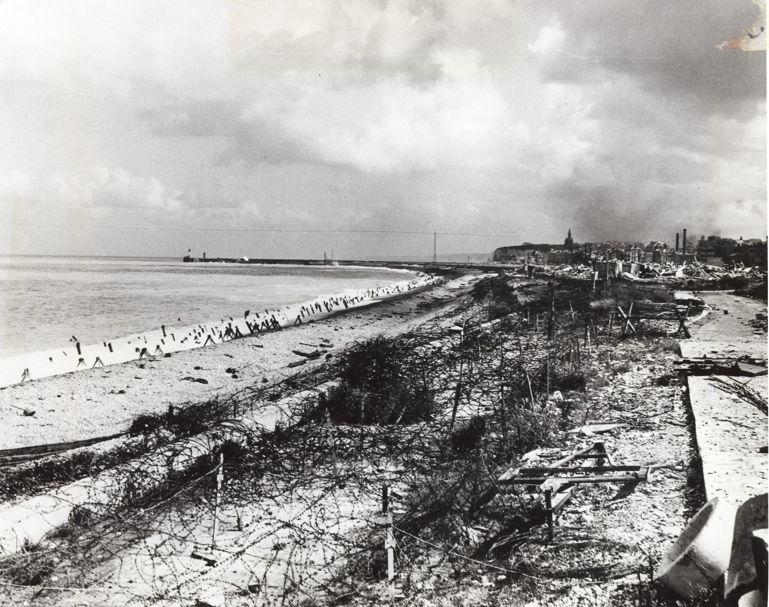 This historic image shows concrete barriers, wire fencing, and other obstacles on the beach.