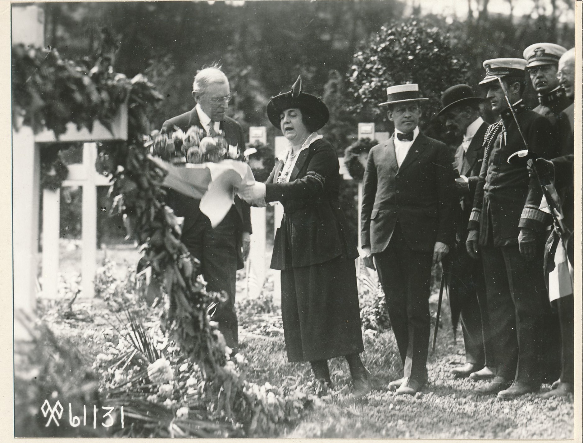 This historic photo shows Wilson and his wife preparing to lay a wreath.