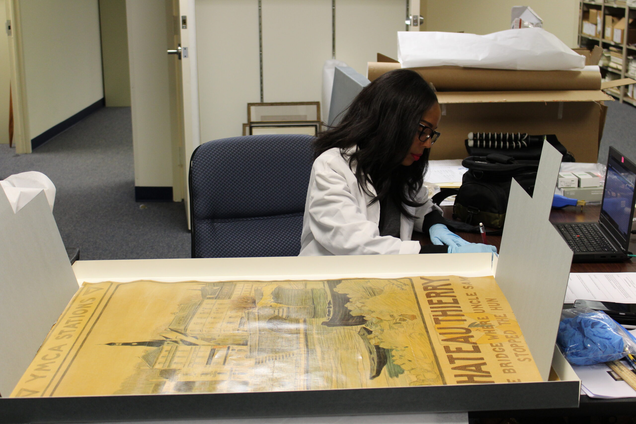 Thomas, in a white coat and gloves, works to process the historic poster.