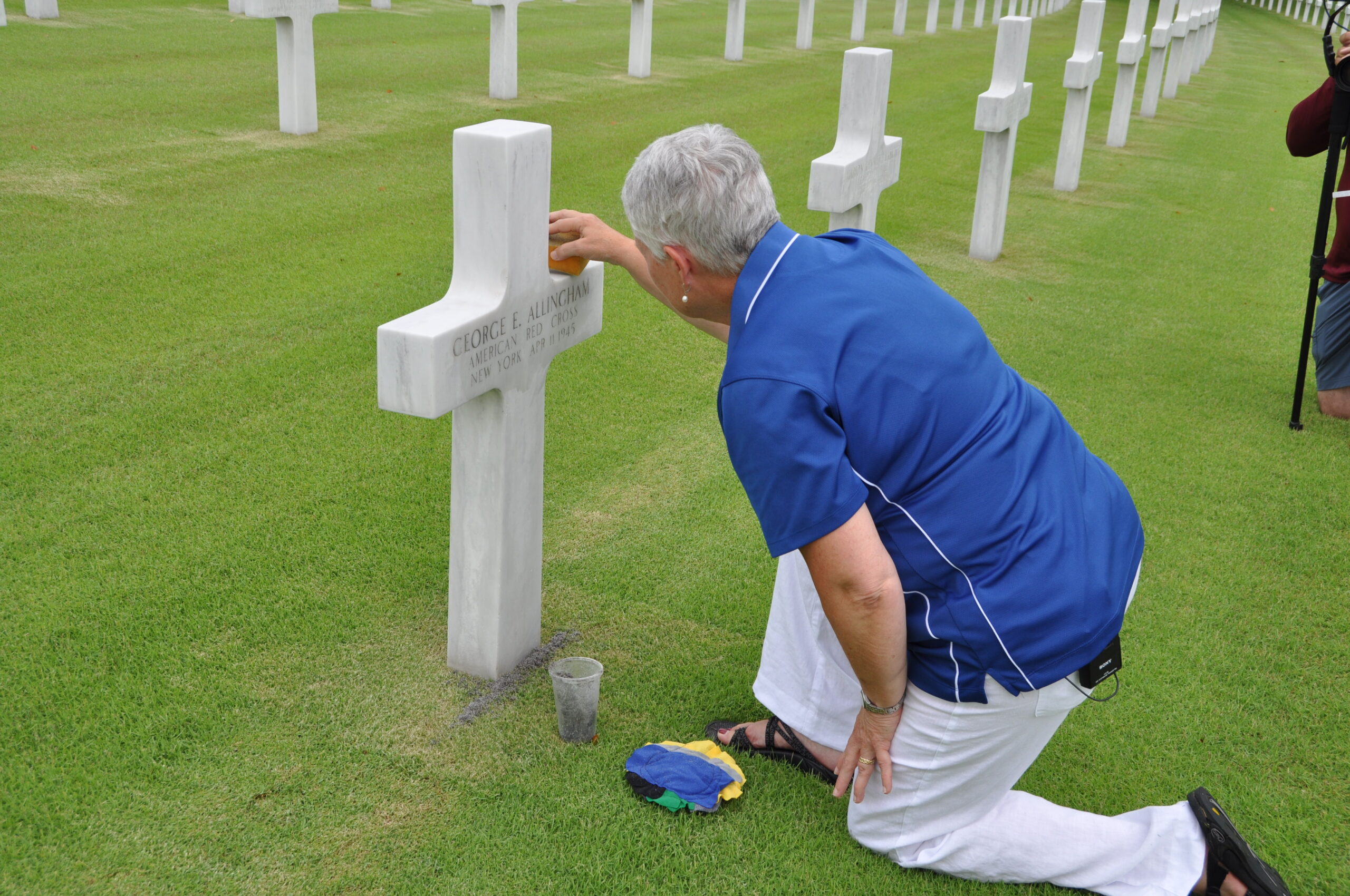 Teacher Marion Touzel sands the headstone of American Red Cross worker George E. Allingham