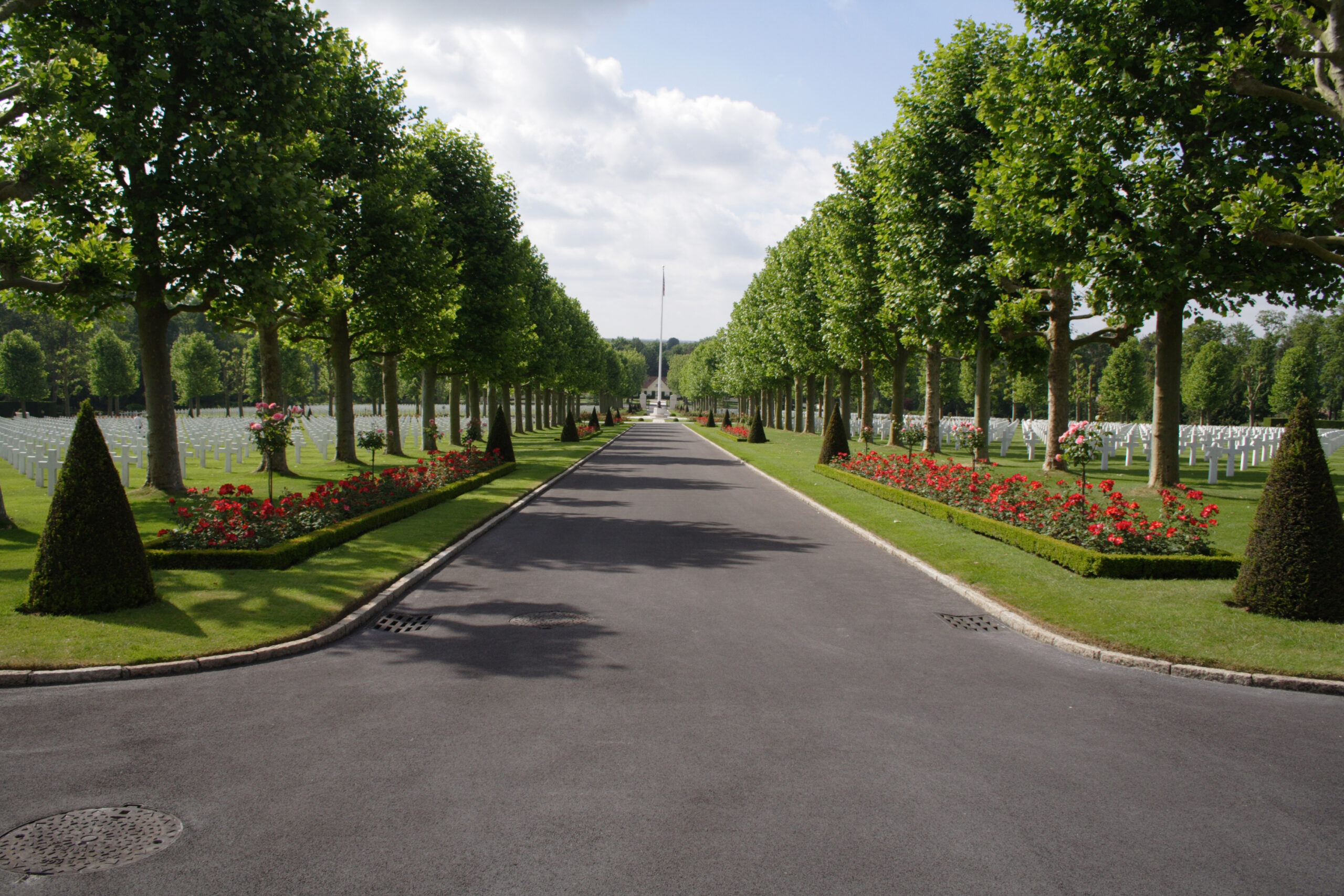 Trees and flowers line a pathway through rows of headstones at Oise-Aisne American Cemetery.