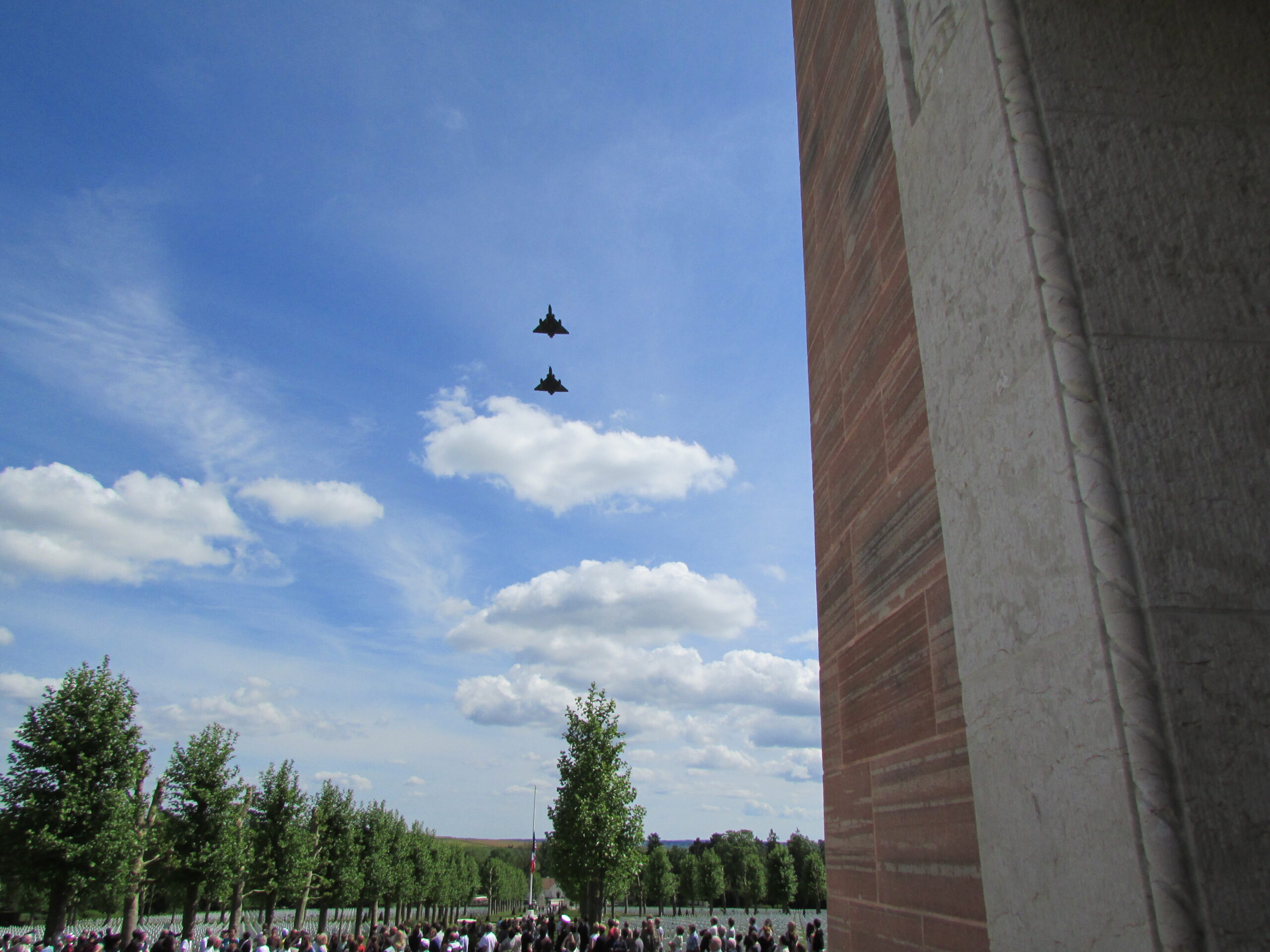 Two French fighter jets fly over Oise-Aisne American Cemetery in France during the 2014 Memorial Day Ceremony.