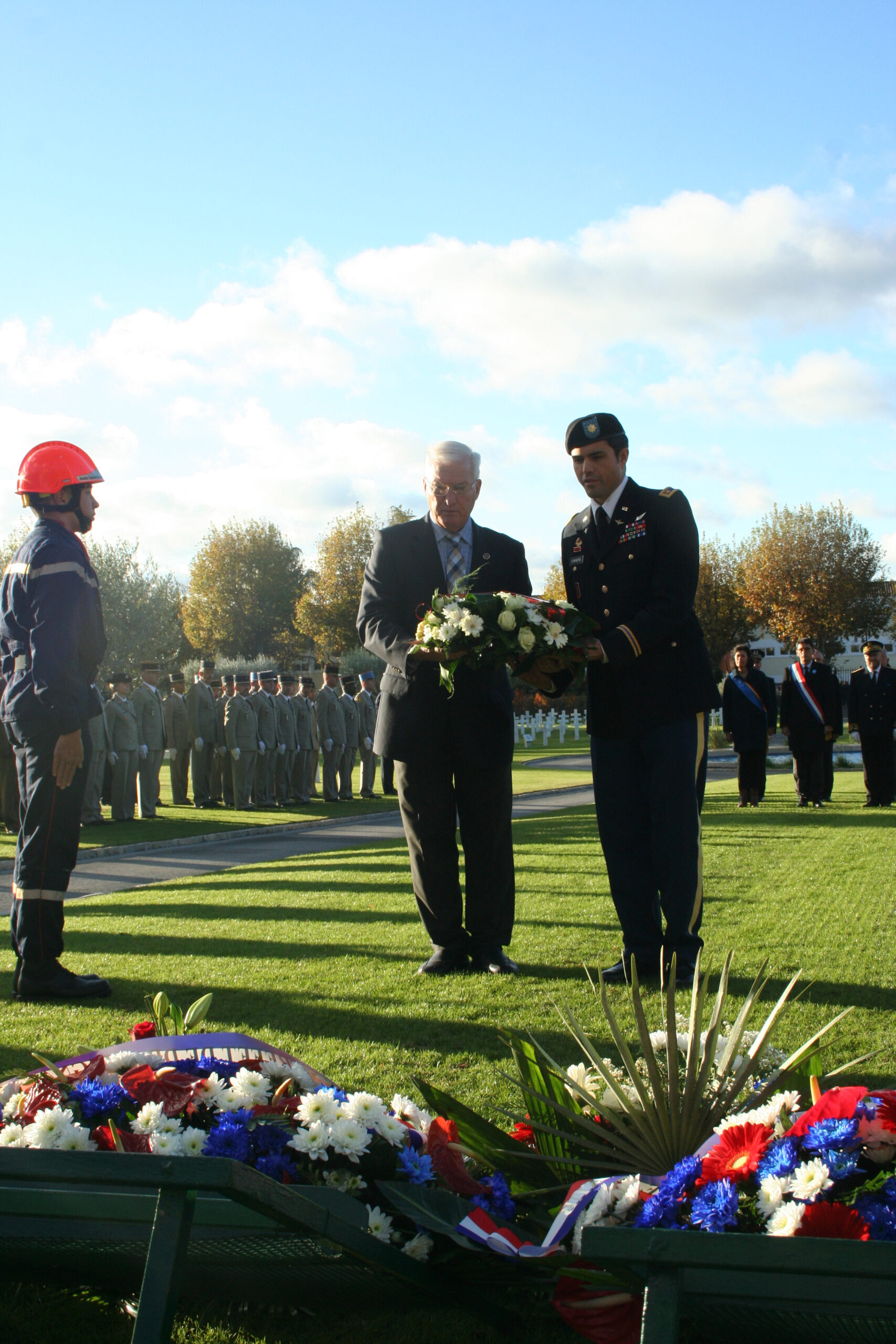 Superintendent Andy Anderson along with a member of the American military lays a floral wreath during the 2016 Veterans Day Ceremony at Rhone American Cemetery.