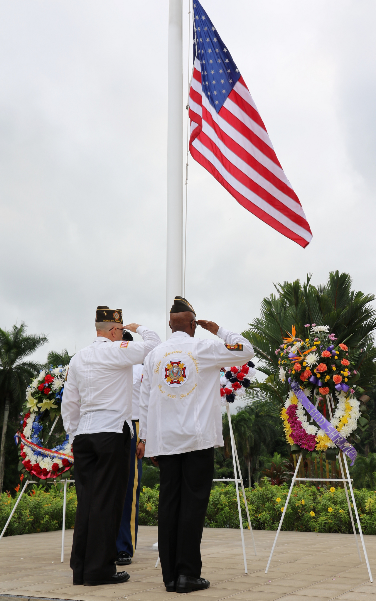 Wreath layers salute after laying a wreath during the 2015 Memorial Day Ceremony at Corozal American Cemetery. Image courtesy of the U.S. Embassy Panama.