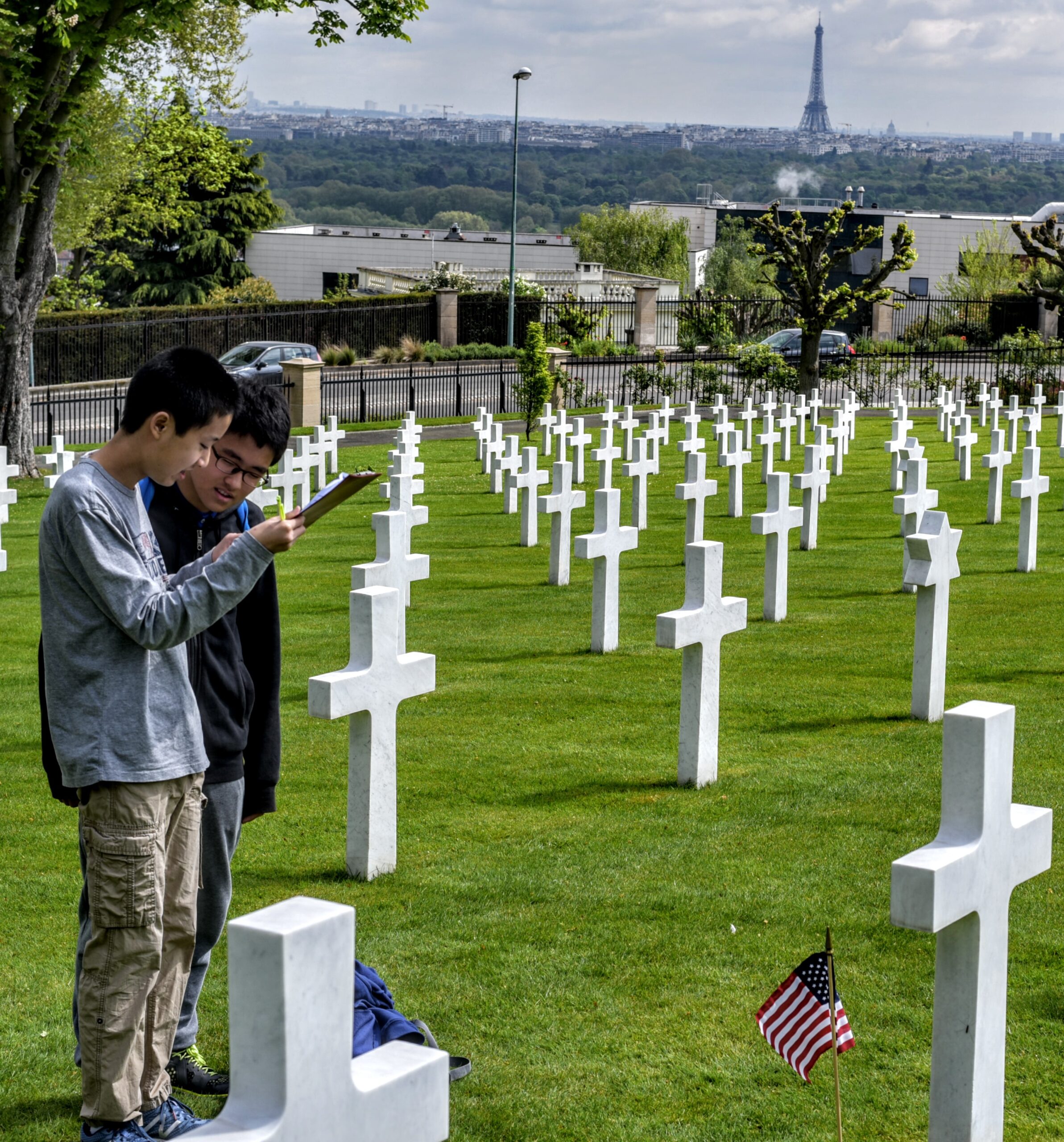 Students from the American School of Paris discuss a new project while visiting Suresnes American Cemetery. Photo credit: Thomas Neville/American School of Paris.