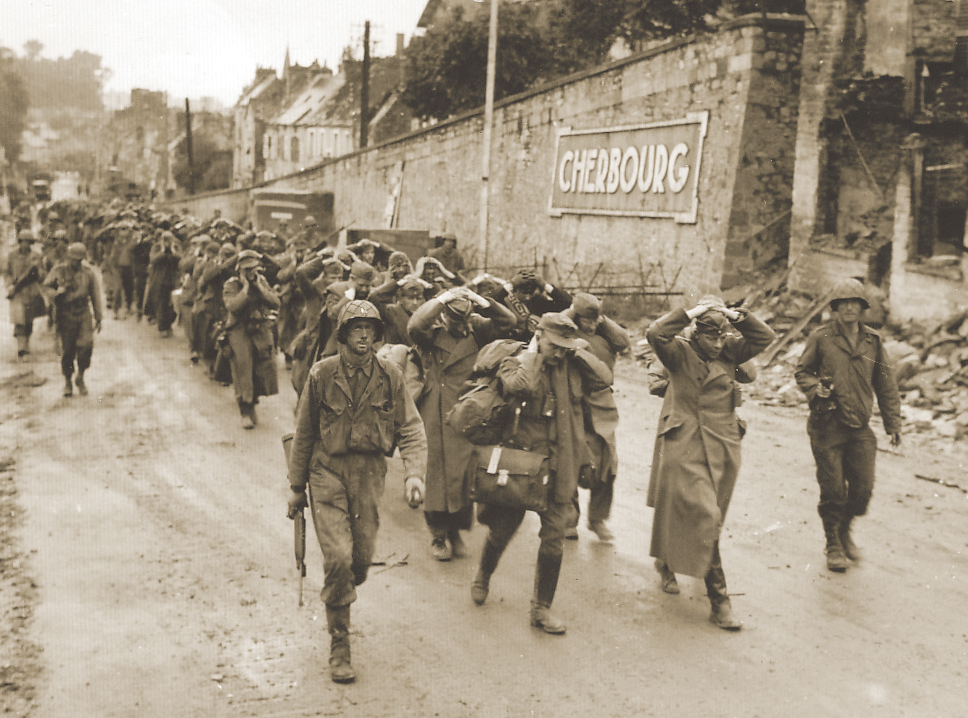 U.S. soldiers escort German prisoners of war, June 28, 1944.