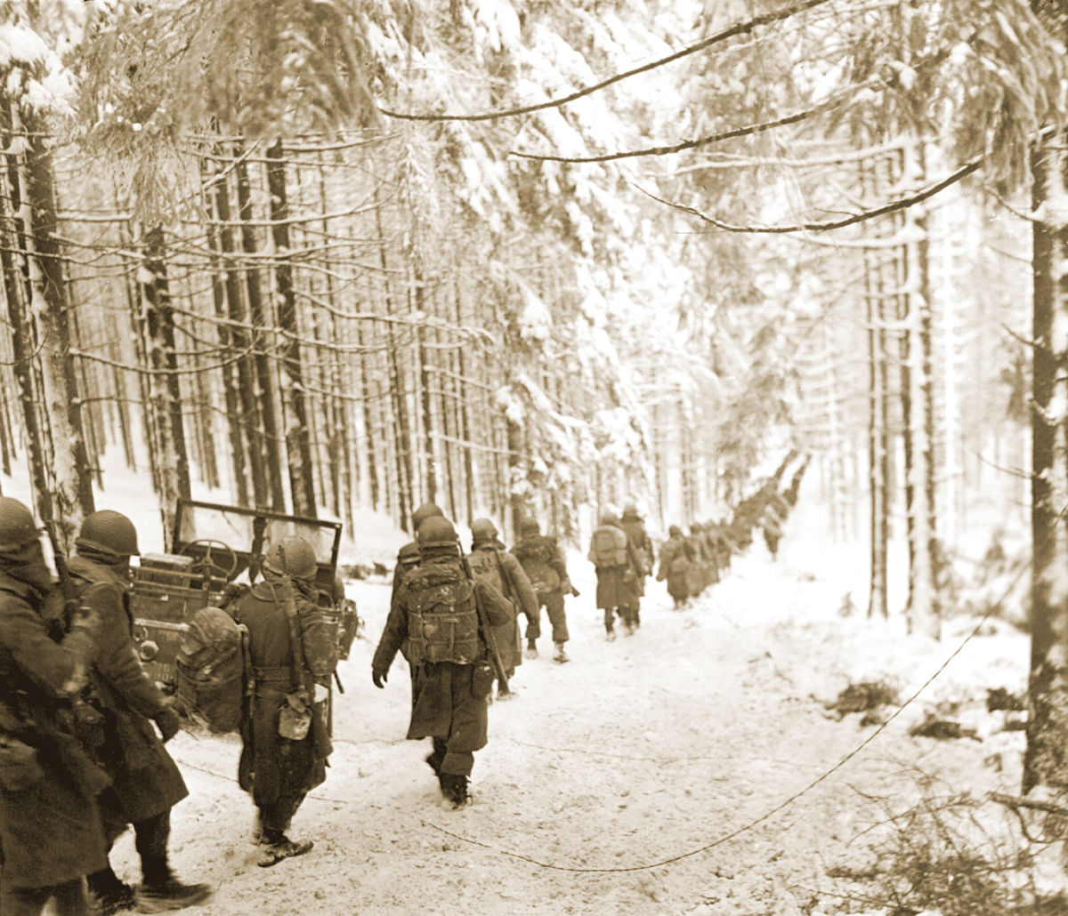 U.S. soldiers march to cut off the St.Vith-Houffalize road in Belgium. Image courtesy of The National Archives.