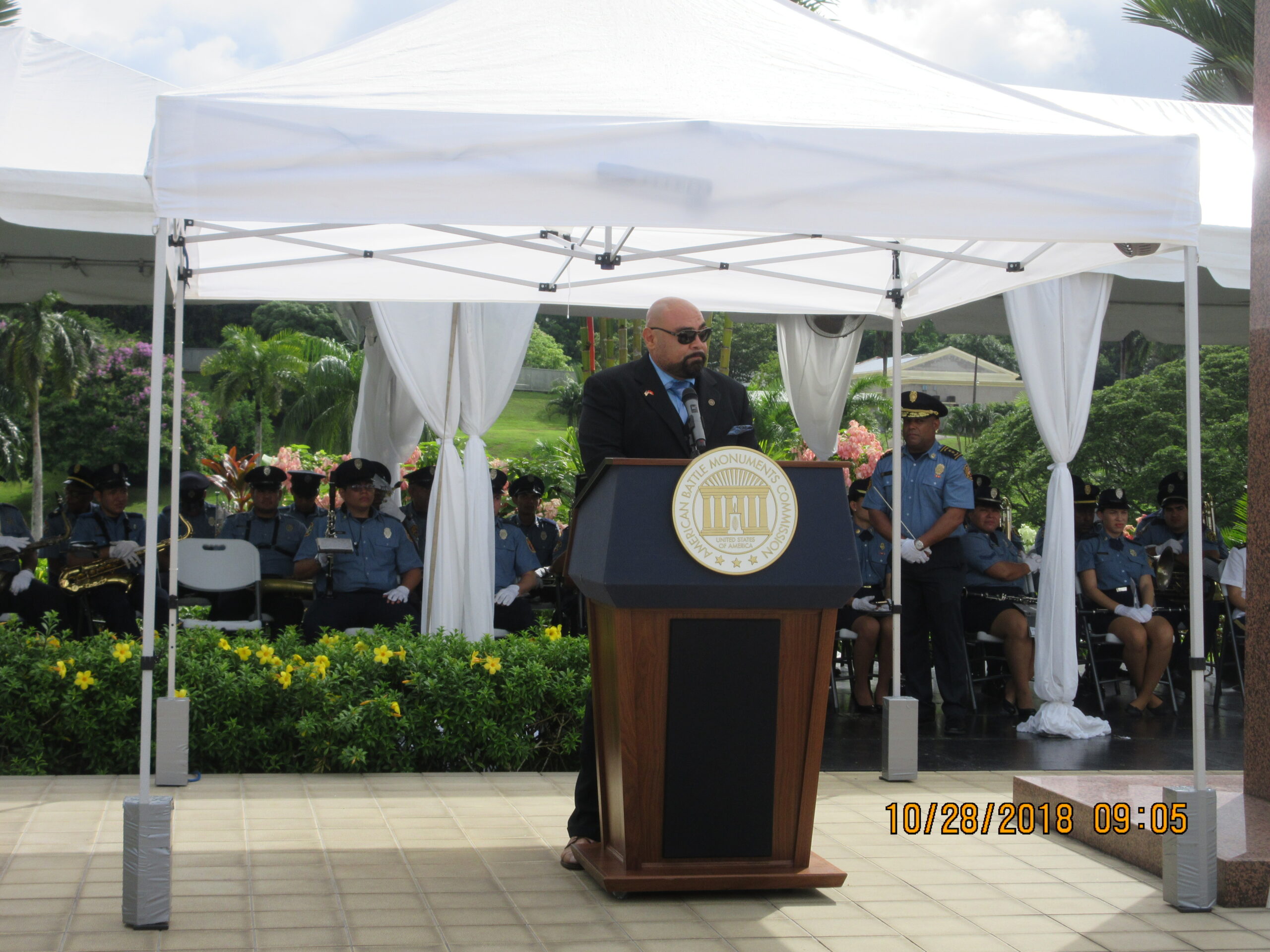 Superintendent Oliver Villalobos delivers remarks during the 2018 Memorial Day Ceremony at Corozal American Cemetery in Panama.