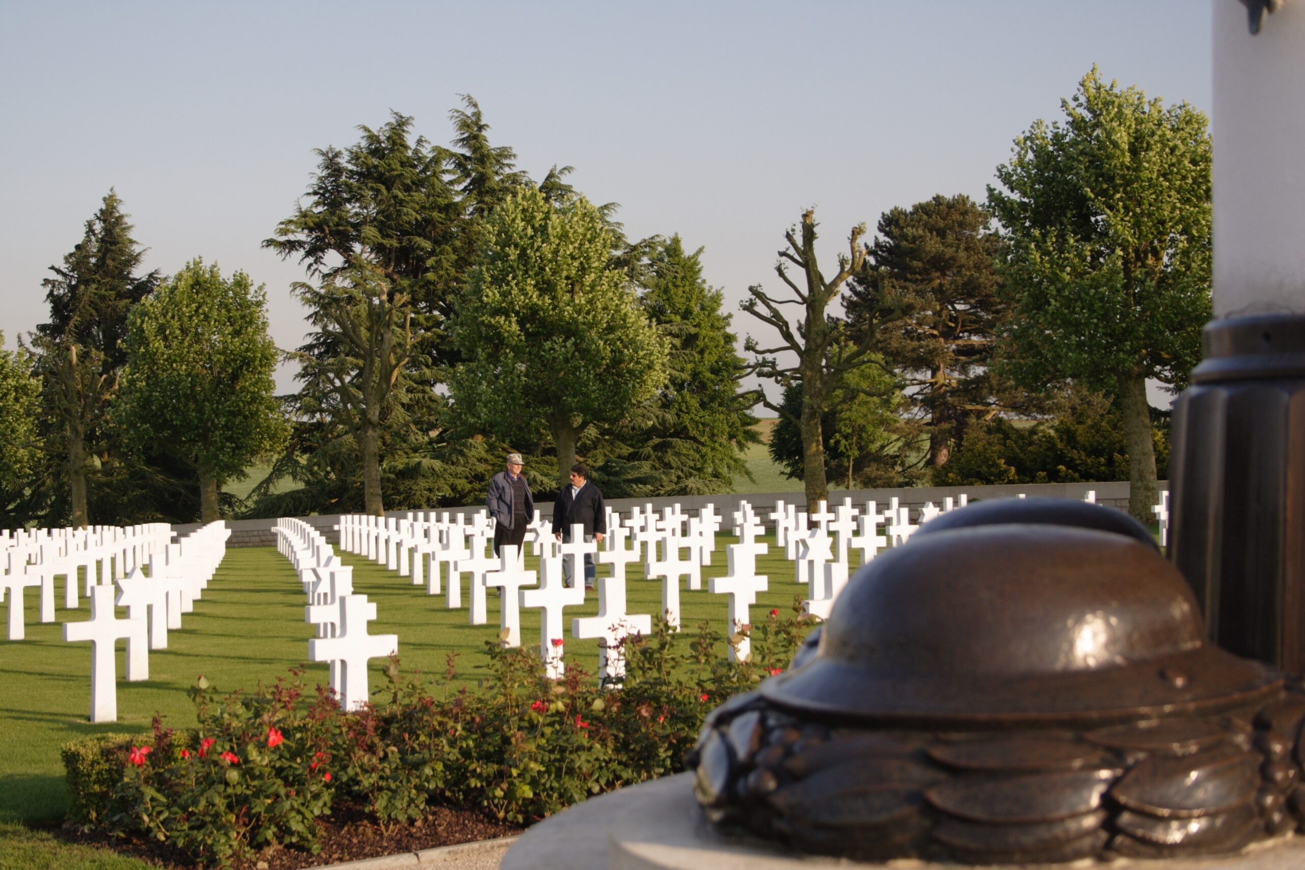 Visitors stand among the rows of white headstones at Somme American Cemetery.