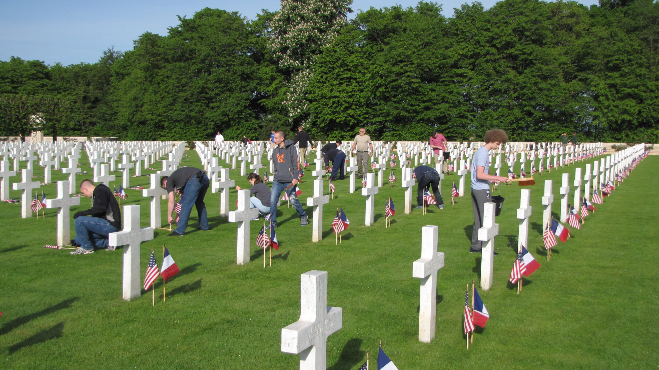 Volunteers place American and French flags in front of every headstone.