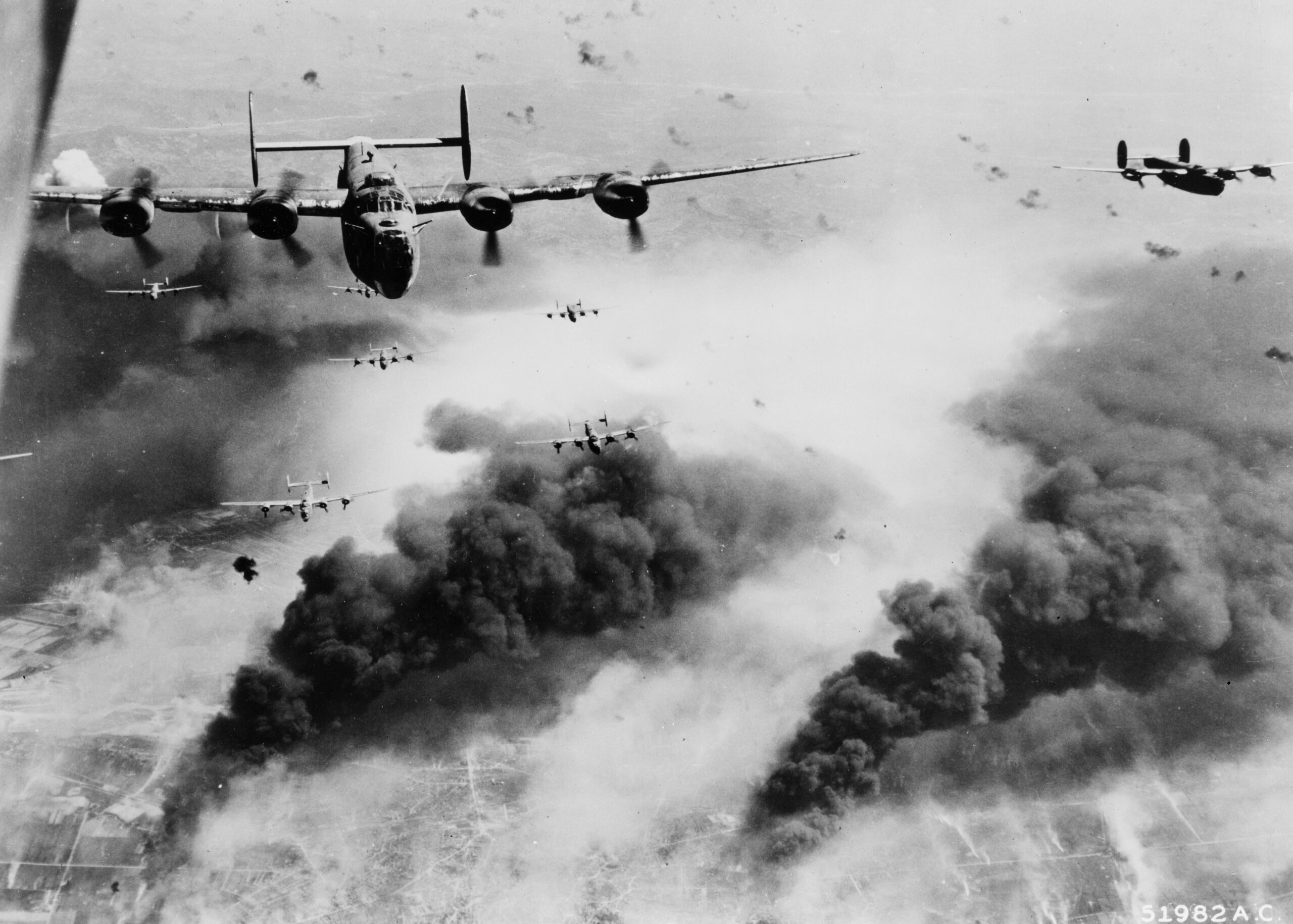 Waves of B-24 Liberators of the 15th Air Force fly over the target area of the Concordia Vega Oil refinery in Ploiești, Romania, unmindful of bursting flak, after dropping their bomb loads on May 31, 1944. Image courtesy of the Library of Congress.