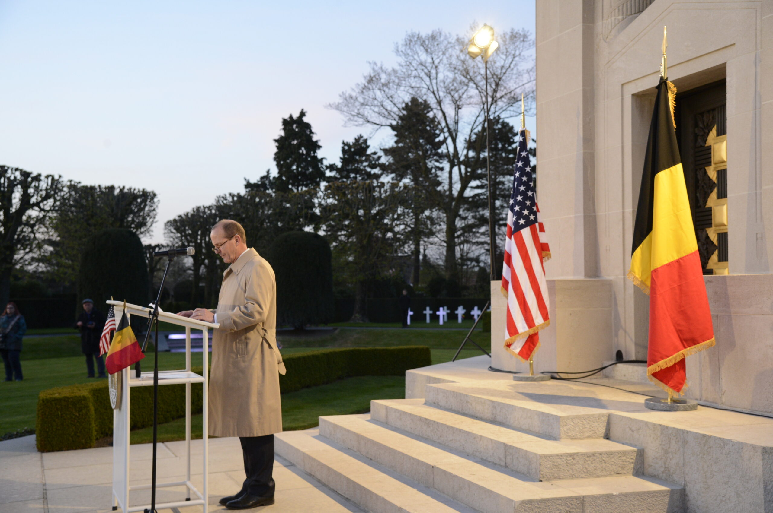 ABMC Deputy Secretary for Overseas Operations delivers remarks during the ceremony. Image courtesy of the U.S. Embassy in Belgium.