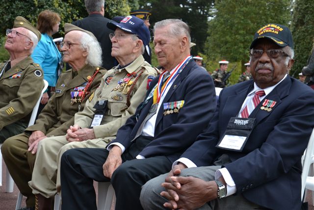 World War II veterans sit in chairs during ceremony.