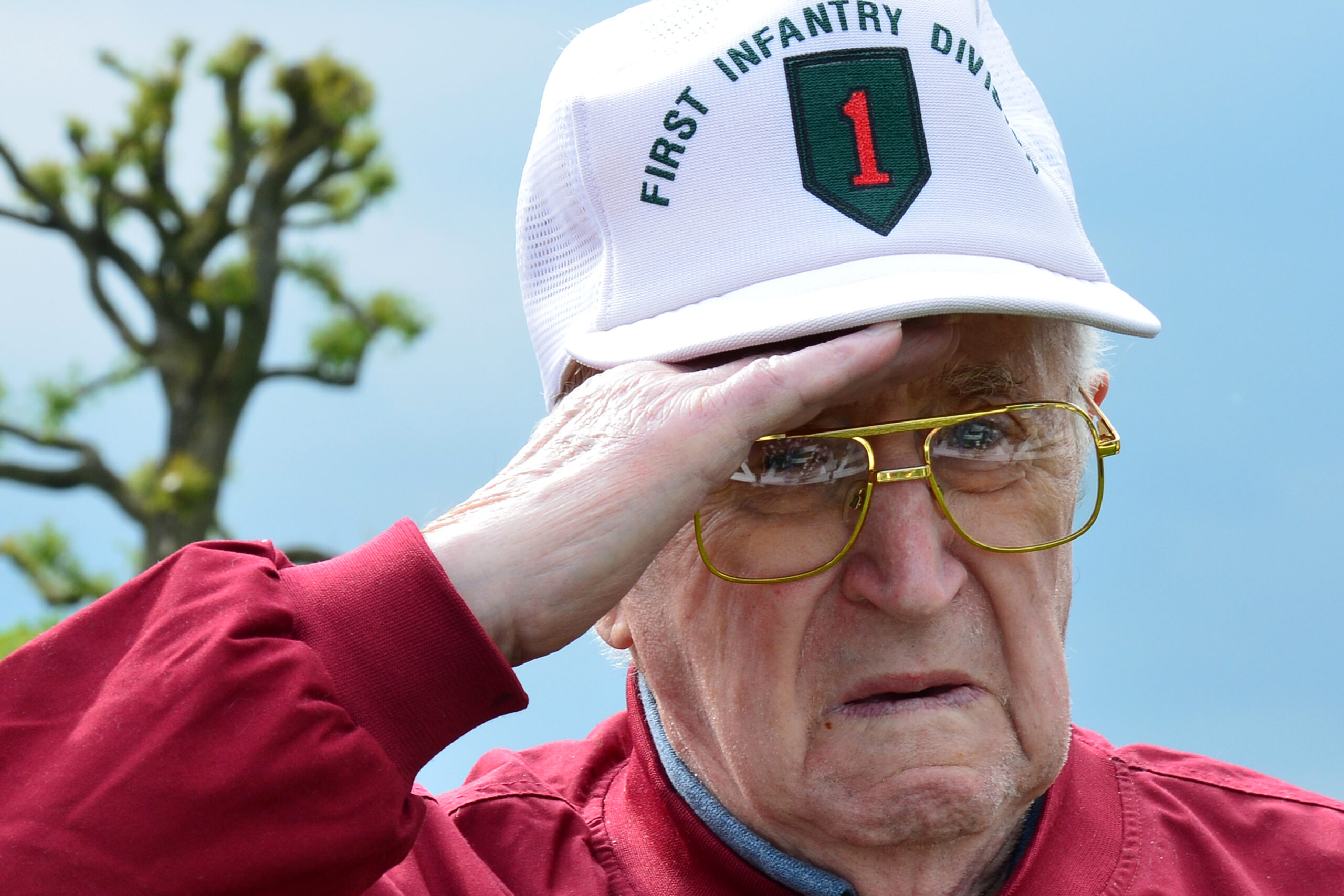 WWII veteran, with a 1st Infantry Division hat, salutes.