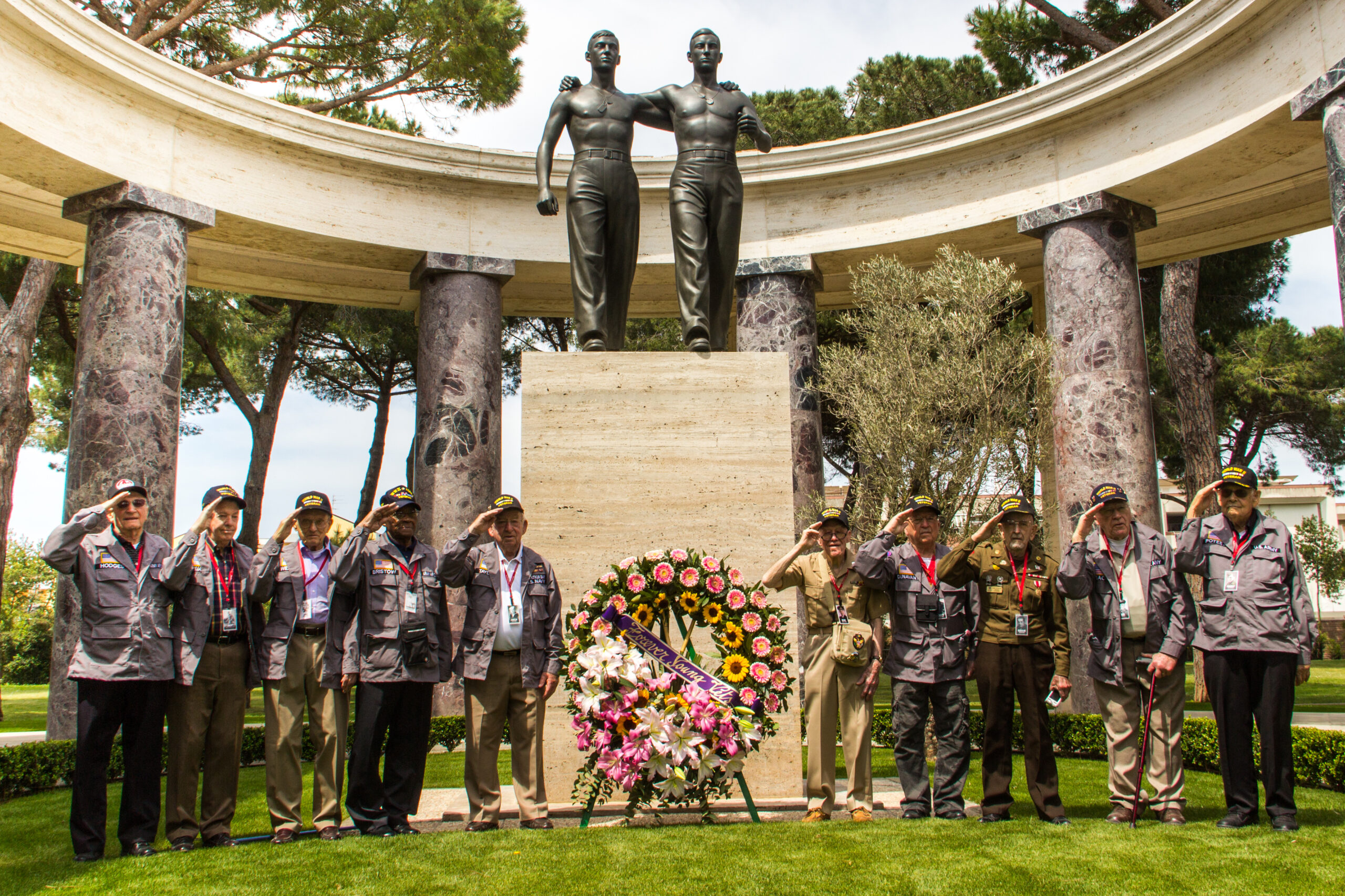 WWII veterans stand and salute after laying a wreath.
