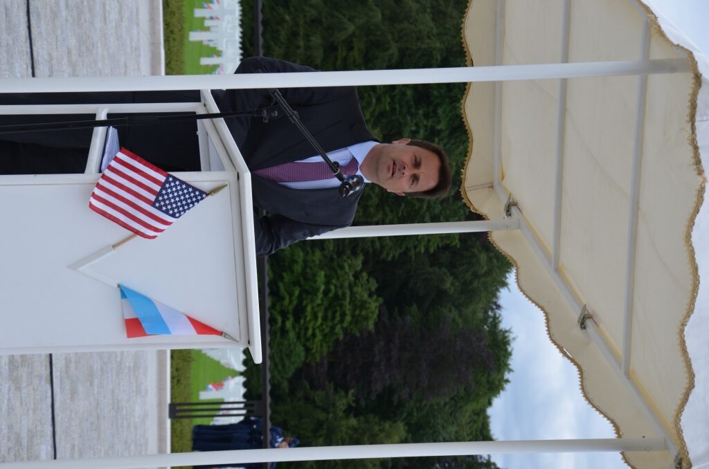 Luxembourg Prime Minister Xavier Bettel delivers remarks during the 2014 Memorial Day Ceremony at Luxembourg American Cemetery.
