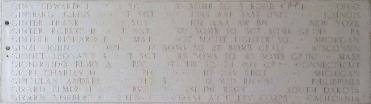 U.S. Army Air Forces Cpl. John J. Ginzl, 27, of Rhinelander, Wisconsin, killed during World War II, was accounted for June 11, 2025. In 1942, Ginzl was assigned to 17th Bombardment Squadron, 27th Bombardment Group on the Bataan Peninsula, in the Philippines.