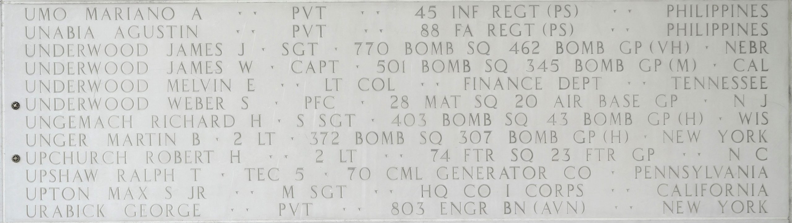 U.S. Army Air Forces Pfc. Weber S. Underwood, 25, who was captured and died as a prisoner of war during World War II, was accounted for Nov. 21, 2025. In 1941, Underwood was a member of 28th Materiel Squadron, 20th Air Base Group, when Japanese forces invaded the Philippine Islands in December.