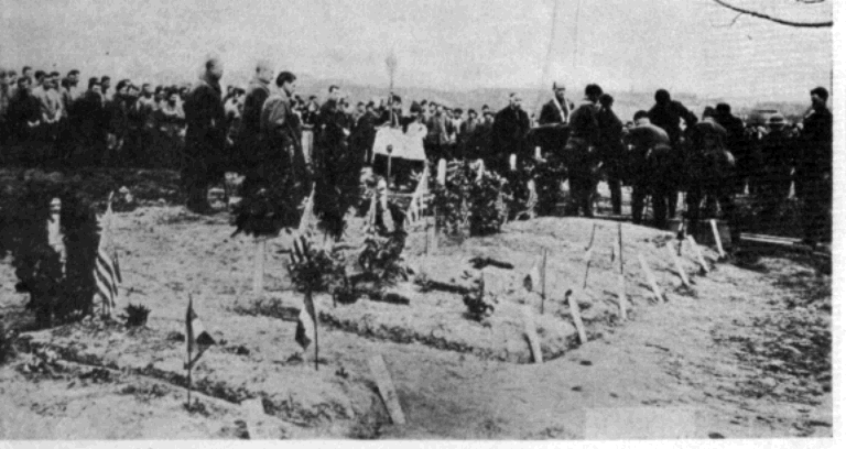 Description: The memorial service held by soldiers of the Fighting 69th for the 19 men lost in the March 7, 1918, Rouge Bouquet bombardment, which served as inspiration for his poem, “Rouge Bouquet.”