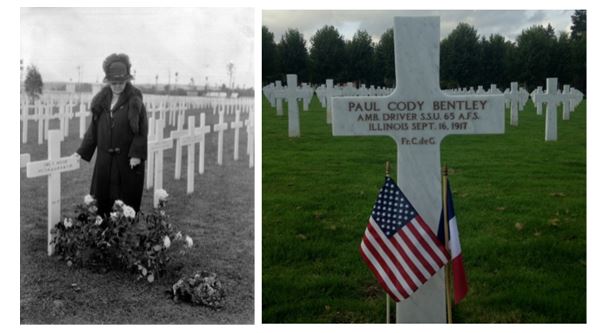 Josephine L. Bentley stands at her son’s grave at Oise-Aisne American Cemetery, 1920s.