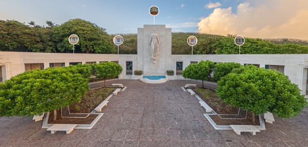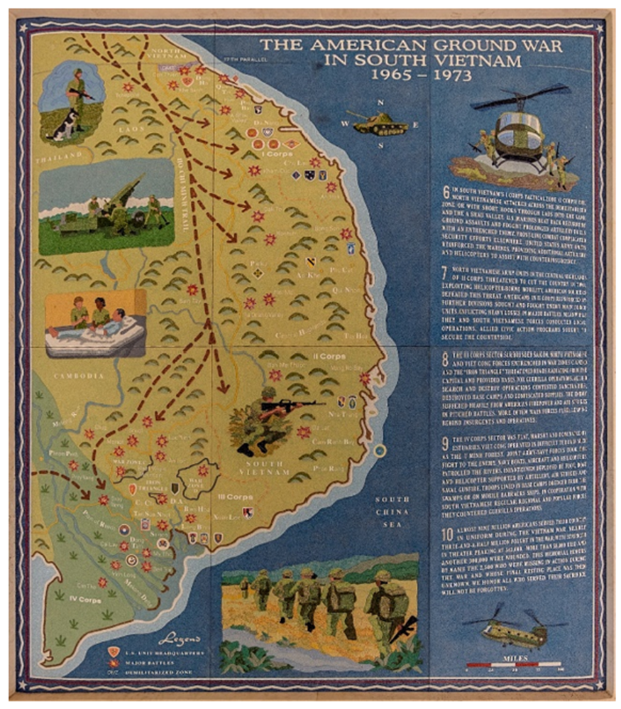 ABMC’s Honolulu Memorial honors the American armed forces who fought in the Pacific during World War II, the Korean War and the Vietnam War. The names of nearly 30,000 service members who lost their lives during these conflicts are memorialized on the Tablets of Missing. To honor their service and contextualize their losses, imposing mosaic battle maps were designed to adorn the Memorial loggias that flanked the Memorial Chapel. Mary Morse Hamilton Jacobs, a well-known artist from Baltimore, Maryland, has twice redesigned these mosaic battle maps displayed. Depicting the overall theater of operations and major battles sites, these mosaic maps are unique works of art, vibrant in color, and charged with honor and memory.