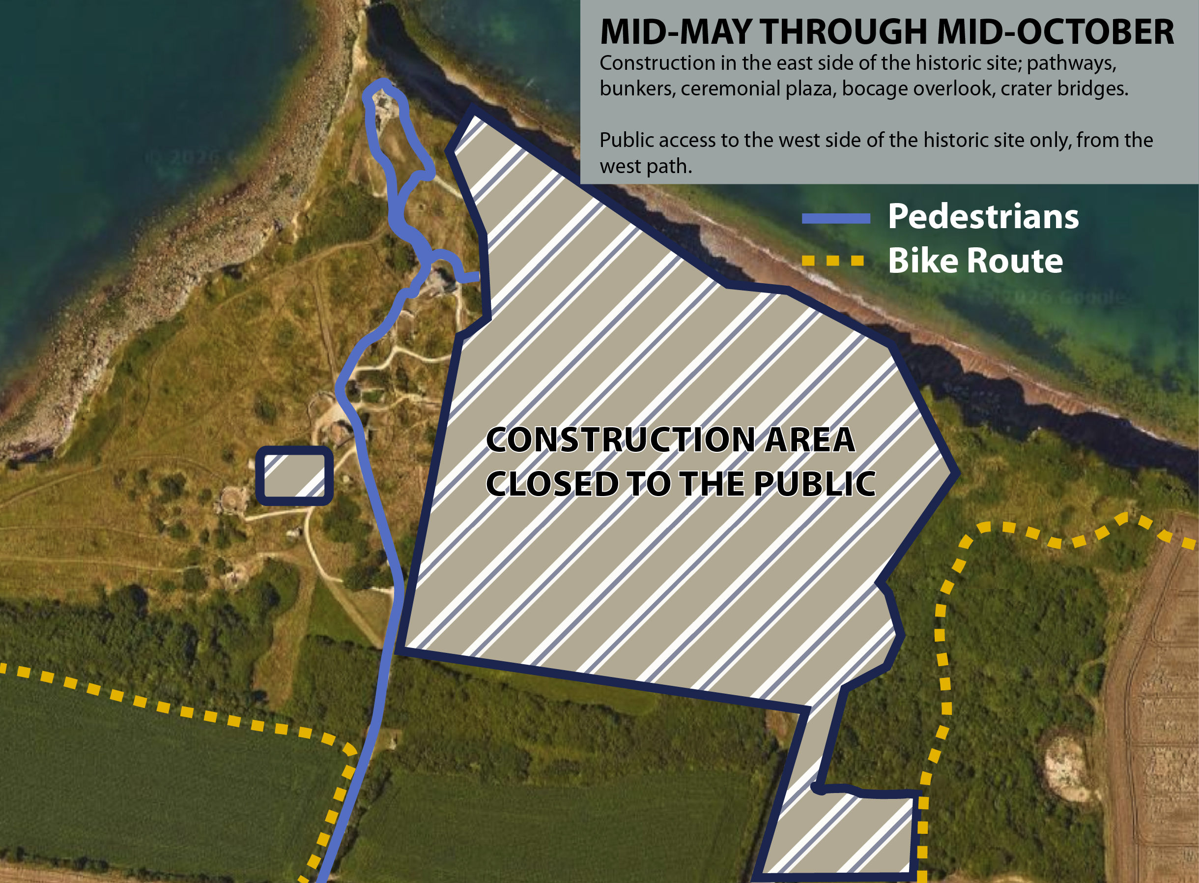 Historic site: Parts of the historic site, including pathways and bunkers, will be closed starting in mid-May 2026. Historic site access will be along the west pathway only. Those pathways that remain open to the public will be clearly marked.