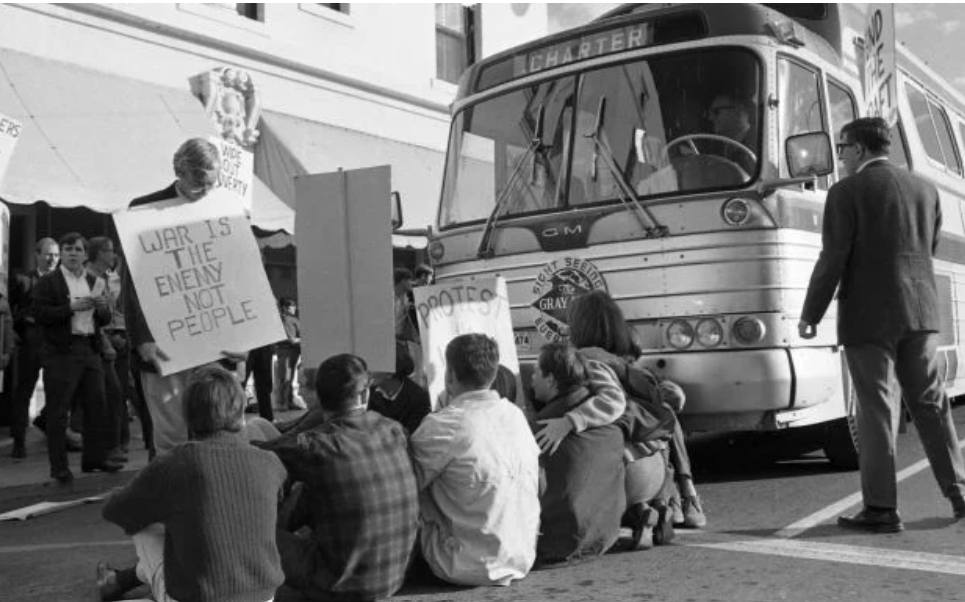 Hopkins, Bill. Anti-draft demonstrators temporarily defied the takeoff of a busload of inductees from a downtown Scott Avenue departure point but the bus and a swarm of city policemen won out on December 5, 1967. Photograph. Tucson Citizen [Tuscson, AZ], December 5, 1967. https://tucson.com/news/retrotucson/photos-vietnam-war-protests-in-tucson/collection_ffb397d4-3547-51b2-ba9e-7894bfef9d52.html#11.