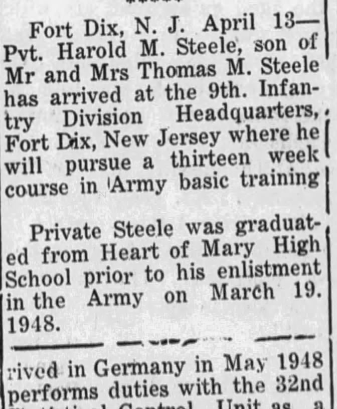 The Steele family lived in the Maysville Historic District of Mobile, Alabama, a working-class neighborhood. Harold’s father, Thomas, registered for the draft during World War II, but it is unknown whether or not he served during the war. Harold attended Heart of Mary High School and left for the U.S. Army shortly after graduating in 1948.
