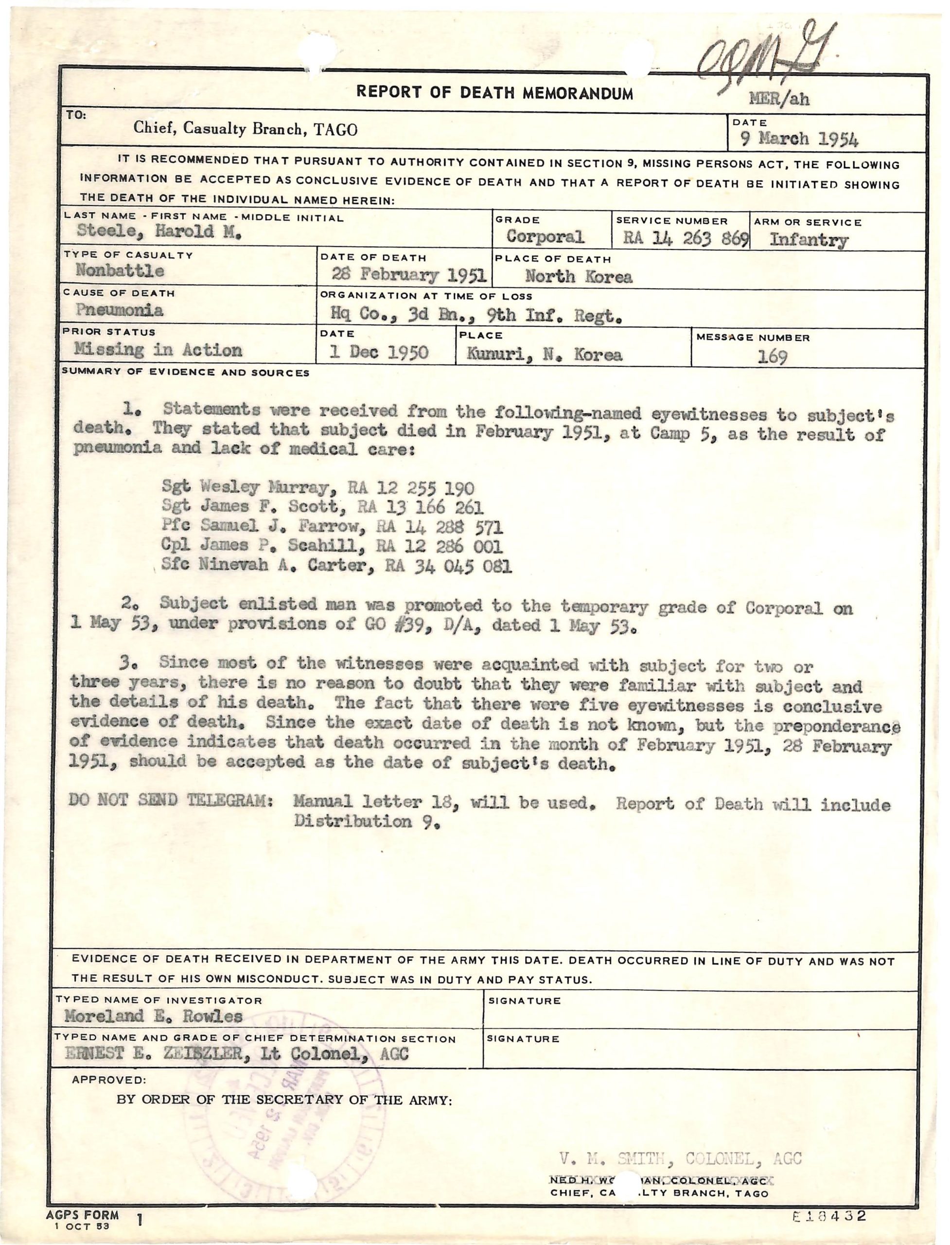 Harold M. Steele. U.S., Korean War Casualties, 1950-1957. https://ancestry.com.