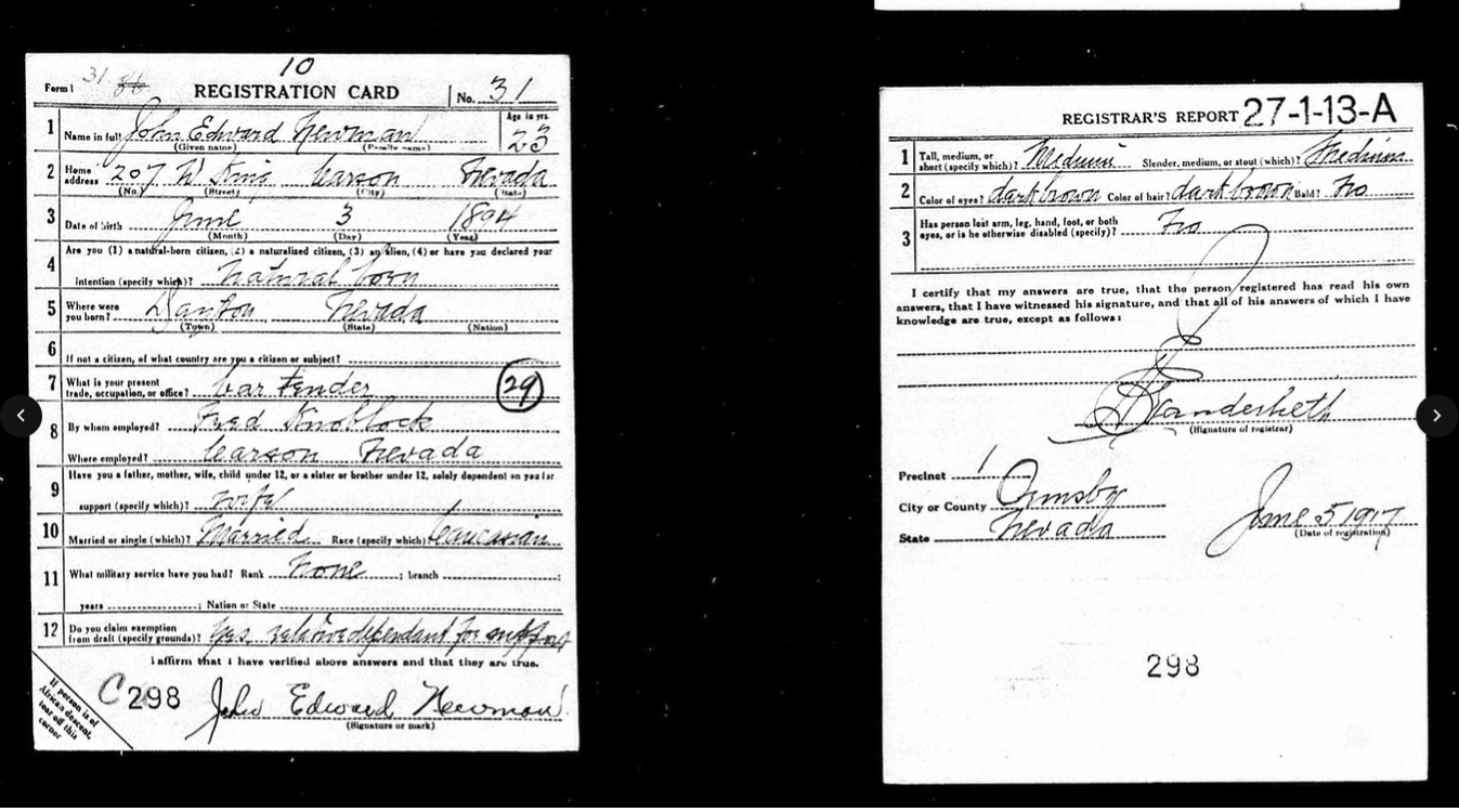 Although the Selective Service requested only 162 men, 1,447 Nevadans signed up for the draft by February 1918. In Newman’s case, he joined 15 other men from Ormsby County to register on June 5, 1917. Fewer than 100 days later, he was called into service.