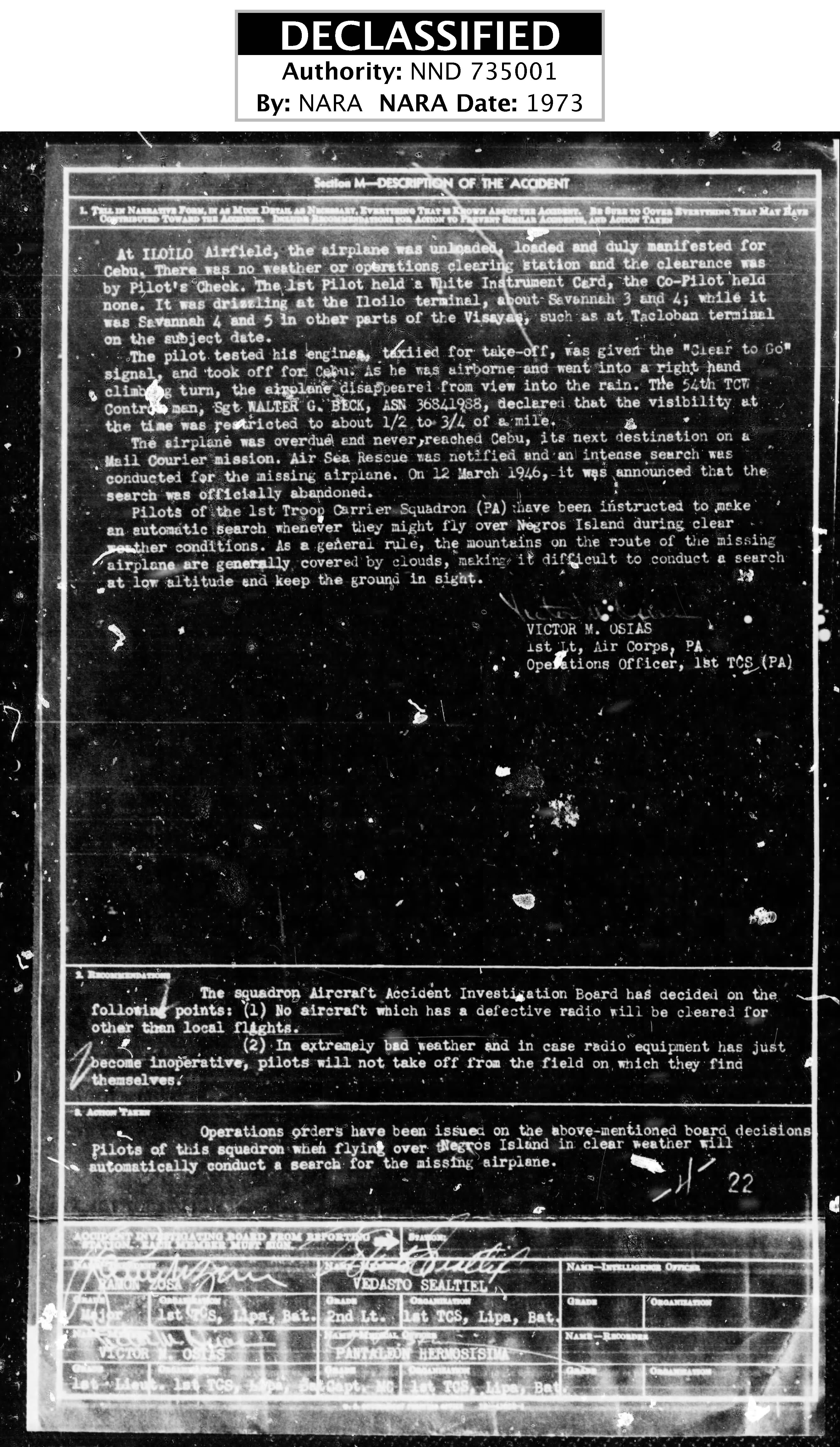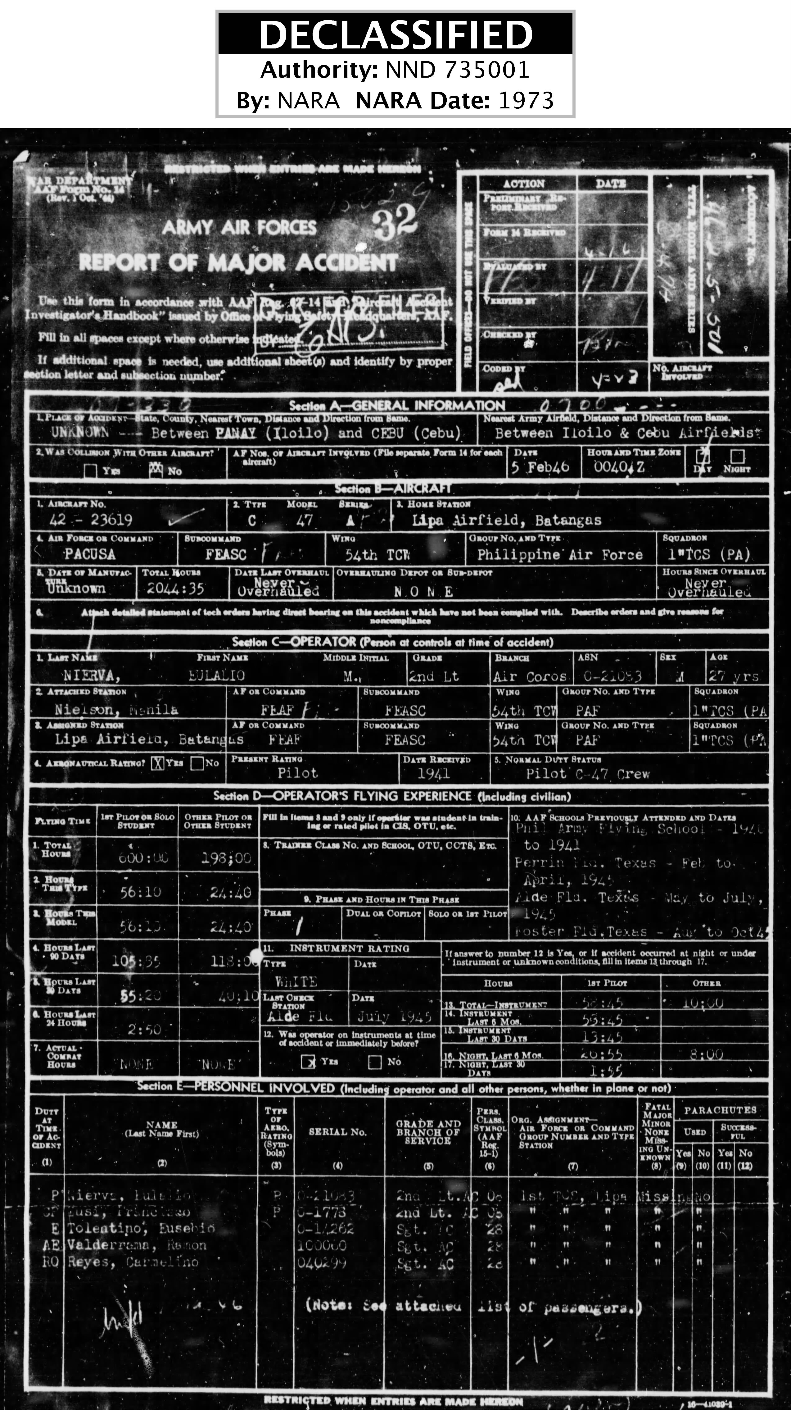 In 1964, more than 18 years after the crash, Evelyn’s mother, Mrs. Florence Cantwell, was notified of a remarkable discovery. Cantwell was told by the U.S. Army that students on a mountain climbing excursion in 1961 had found the wreckage and human remains of a C-47 transport plane on Mount Canalaon on Negros Island, which lies between the Panay and Cebu Islands.