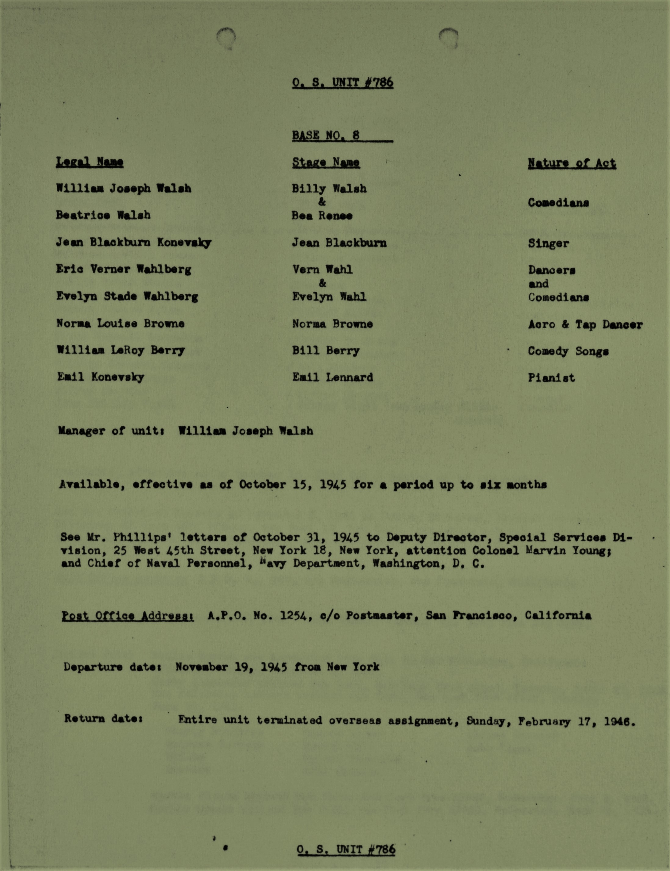 Records of Camp Shows, Inc.; Records of the Adjutant General’s Office, Special Service Division 1941-1957, Record Group 407 (Box 7); National Archives at College Park, College Park, MD.